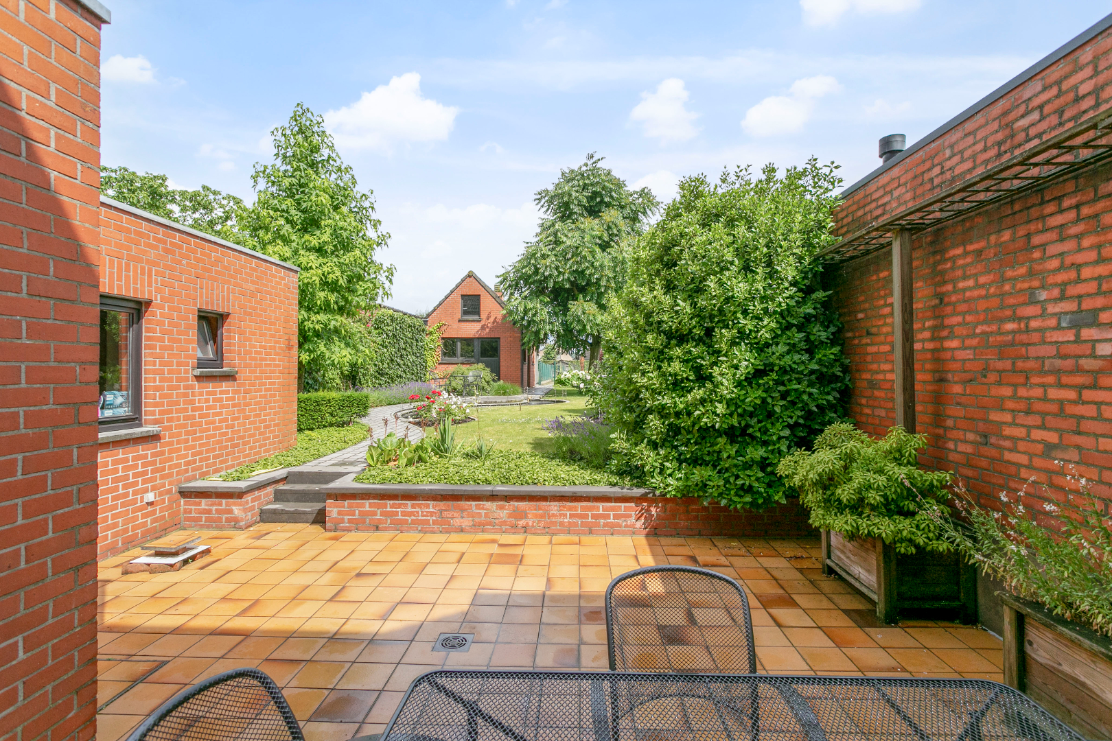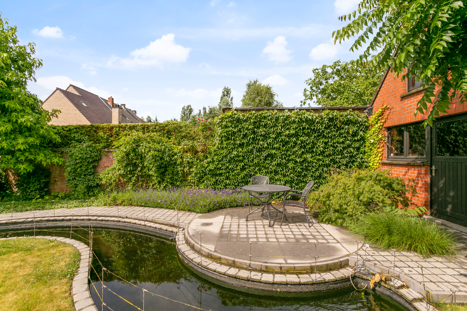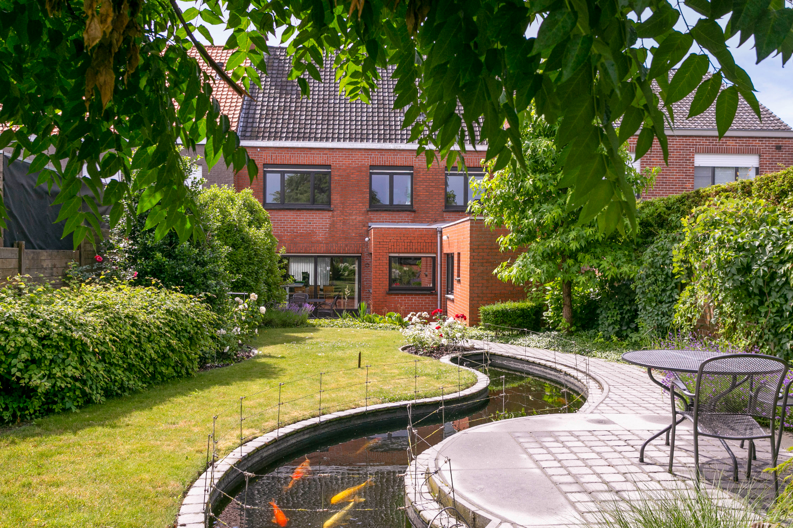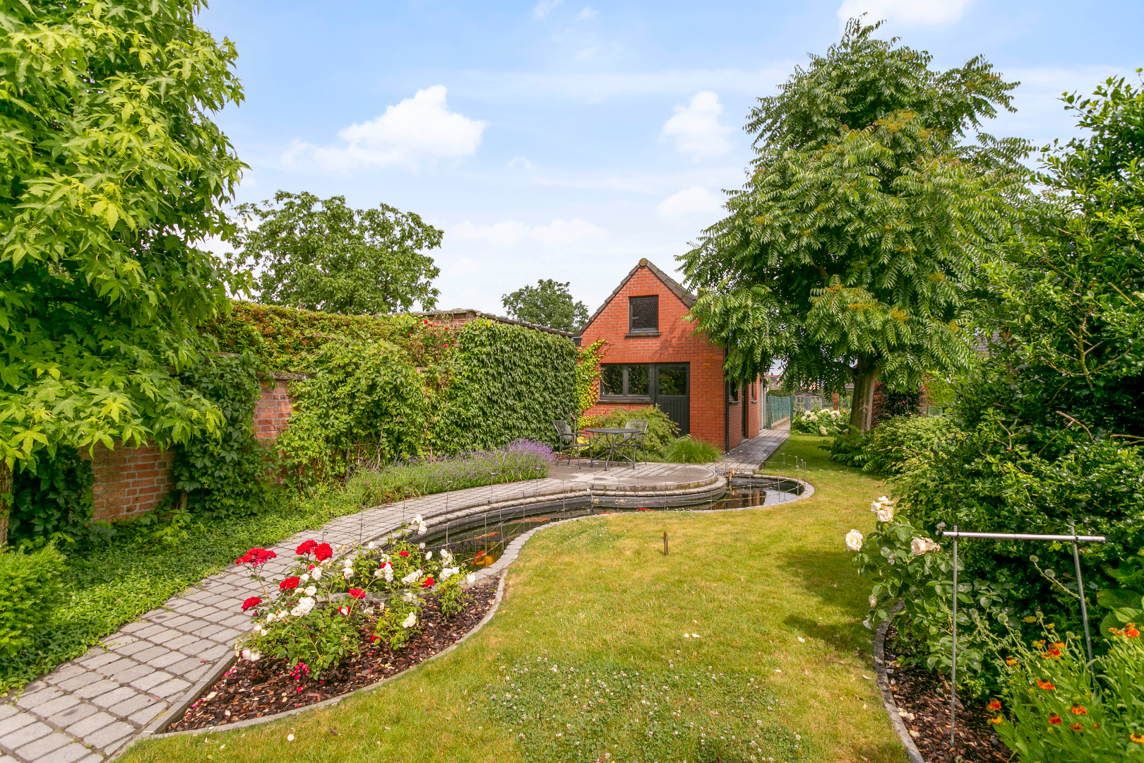 In de grote, diepe tuin en zittend aan de vijver met koi-vissen is het zalig vertoeven. De tuin is heel mooi volgroeid. Er is ook een groot tuinhuis met vliering. De ideale ruimte om uw geliefkoosde hobby uit te oefenen. Achter dit mooie gebouw is er nog een moestuin en een grasperk voor het ‘huisgeitje’.