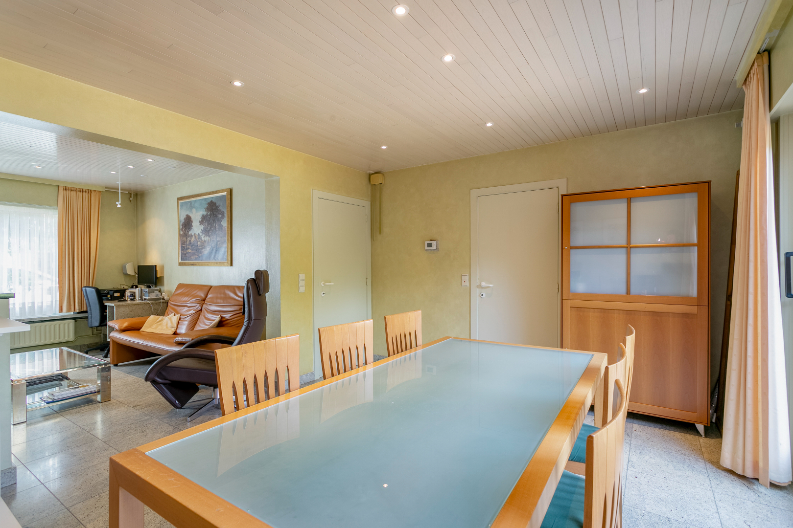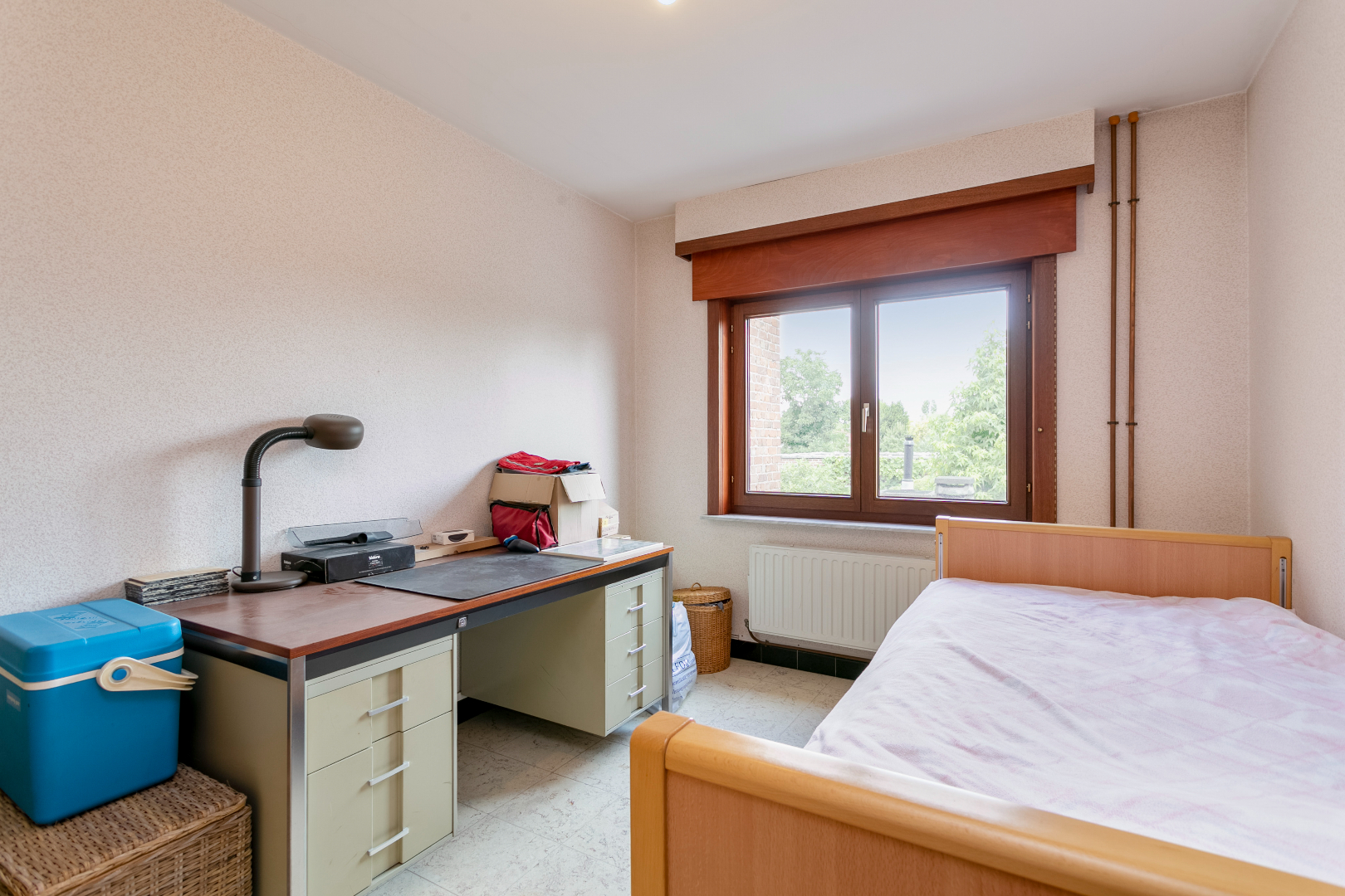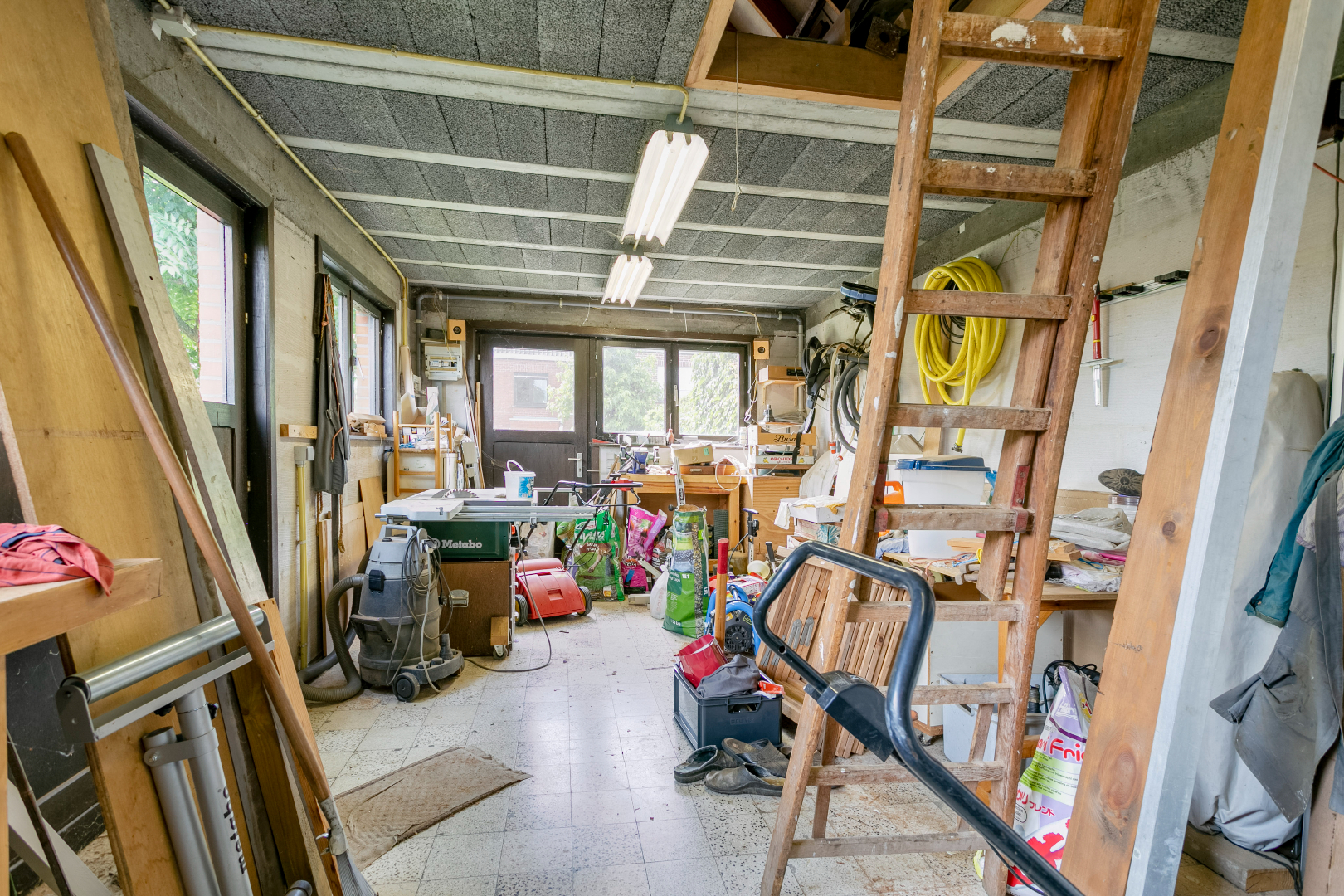 Via de voortuin met oprit komen we de woning binnen in de hal. Van hieruit kunnen we naar bovenverdieping of naar de leefruimte. De leefruimte bestaat uit de eetkamer en het salon. Beiden zijn heel lichtrijk. We hebben van hieruit ook een schitterend zicht op de grote tuin. Aansluitend treffen we de keuken met naastgelegen berging en bijkeuken. Er is voldoende plaats voor een wasmachine en droogkast. Hierachter is er ook nog een eerste badkamer met een toilet, lavabo en douche. Handig om u na het karweien in de diepe tuin of het grote tuinhuis te verfrissen. Op de gelijkvloerse verdieping is er ook nog de garage.
