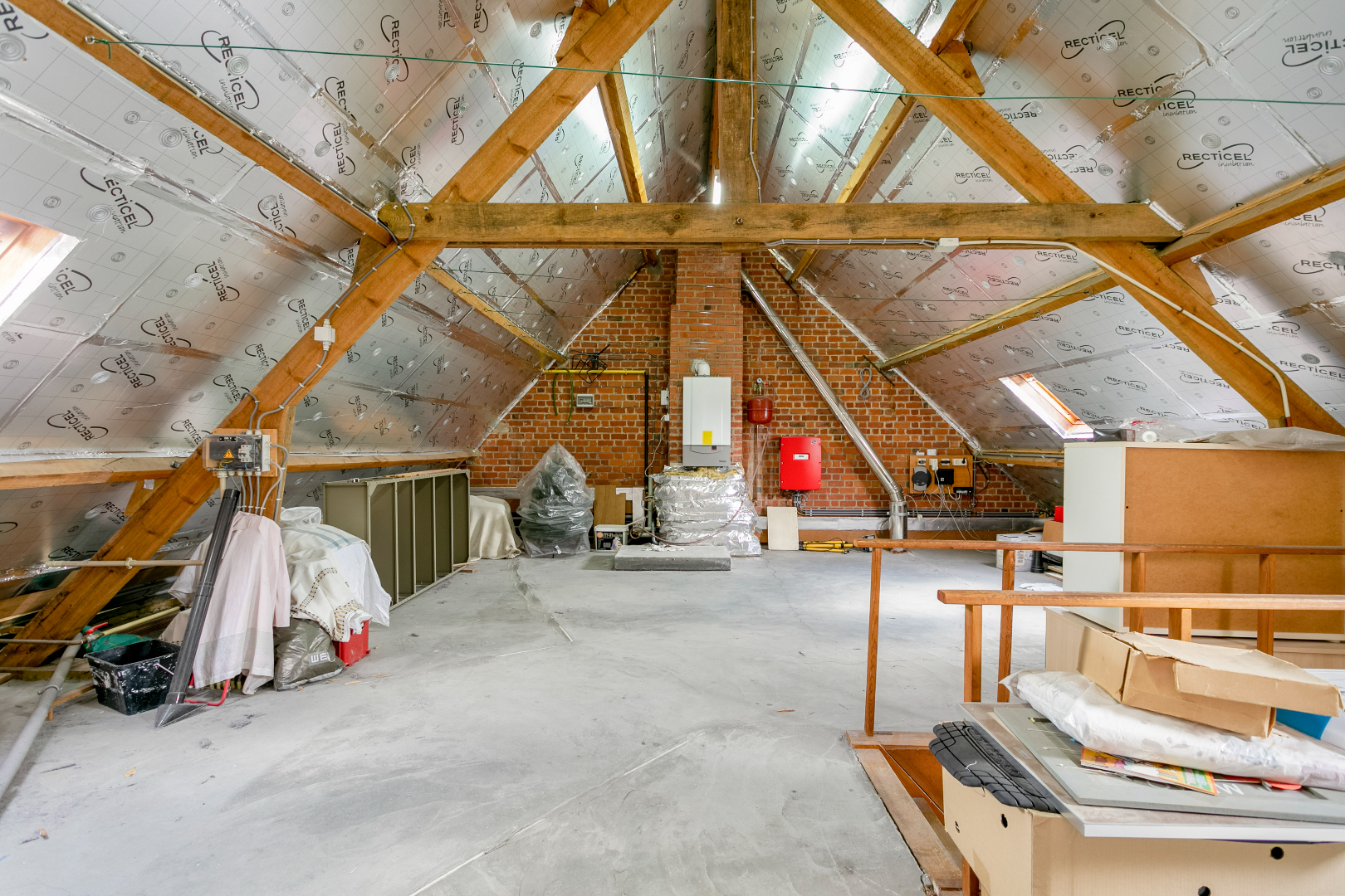 Op de eerste verdieping zijn er 4 slaapkamers en de tweede badkamer. Deze is voorzien van een ligbad, toilet en lavabo. Via de vaste trap gaan we naar de gigantische, geïsoleerde zolder. Hier kunnen nog meerdere kamers of een ontspanningsruimte worden ingericht.