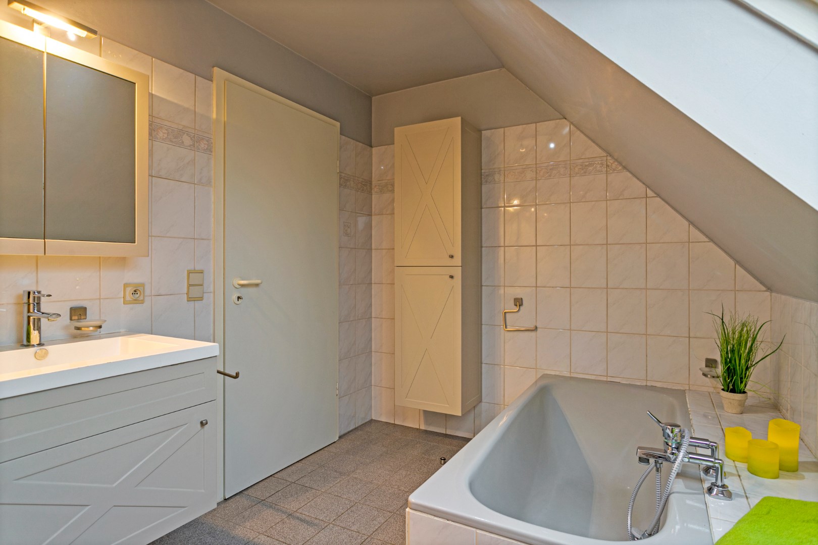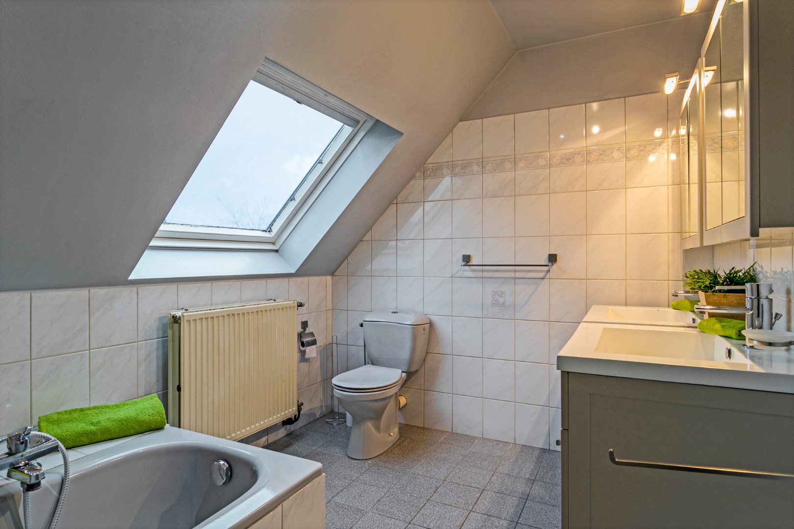 De verdieping beschikt over 3 slaapkamers en een badkamer met dubbel lavabomeubel, ligbad en toilet. Er is tevens een extra bergzolder.