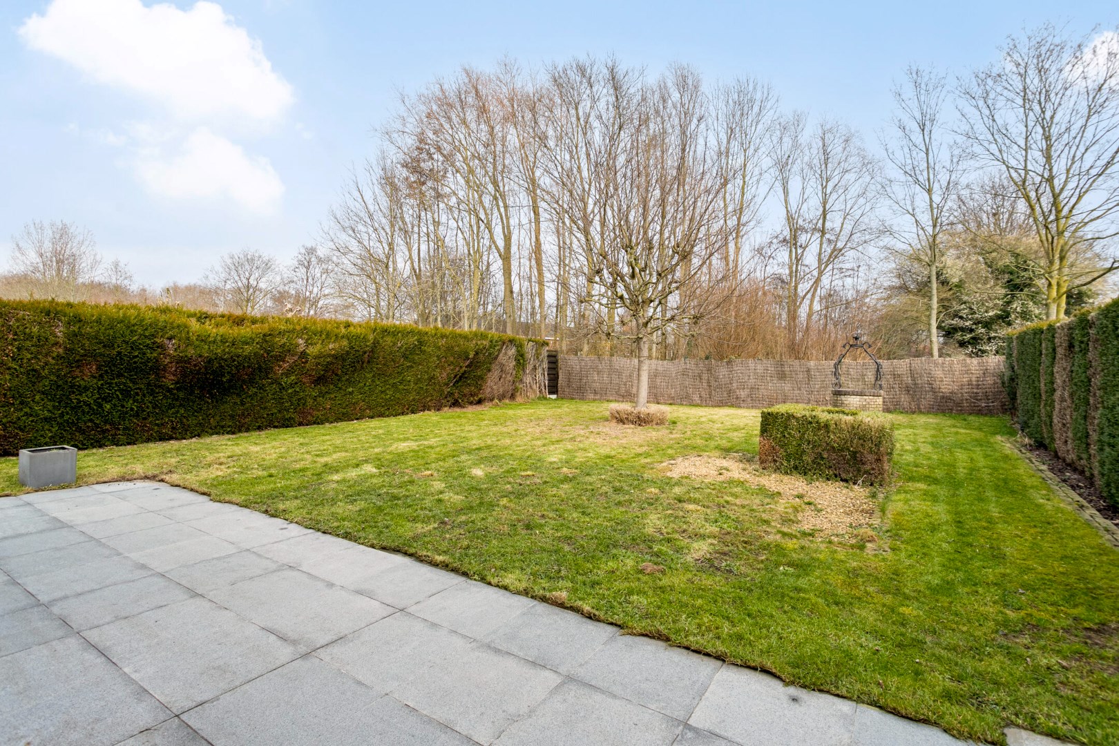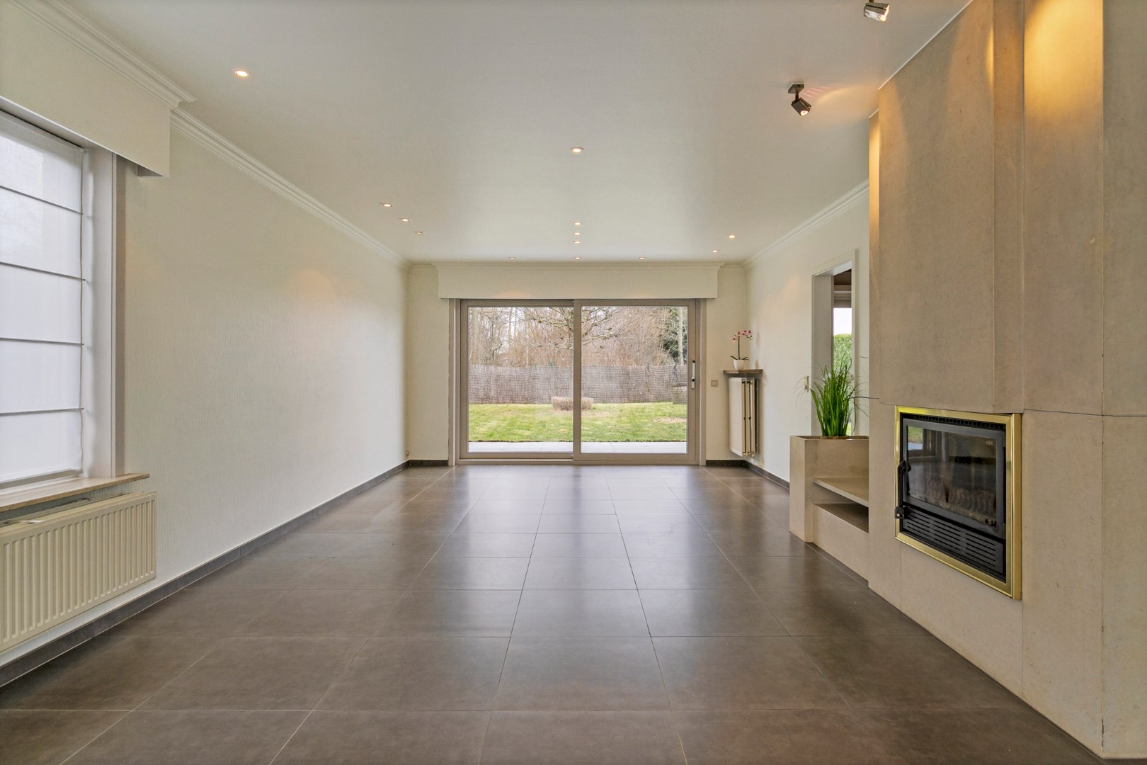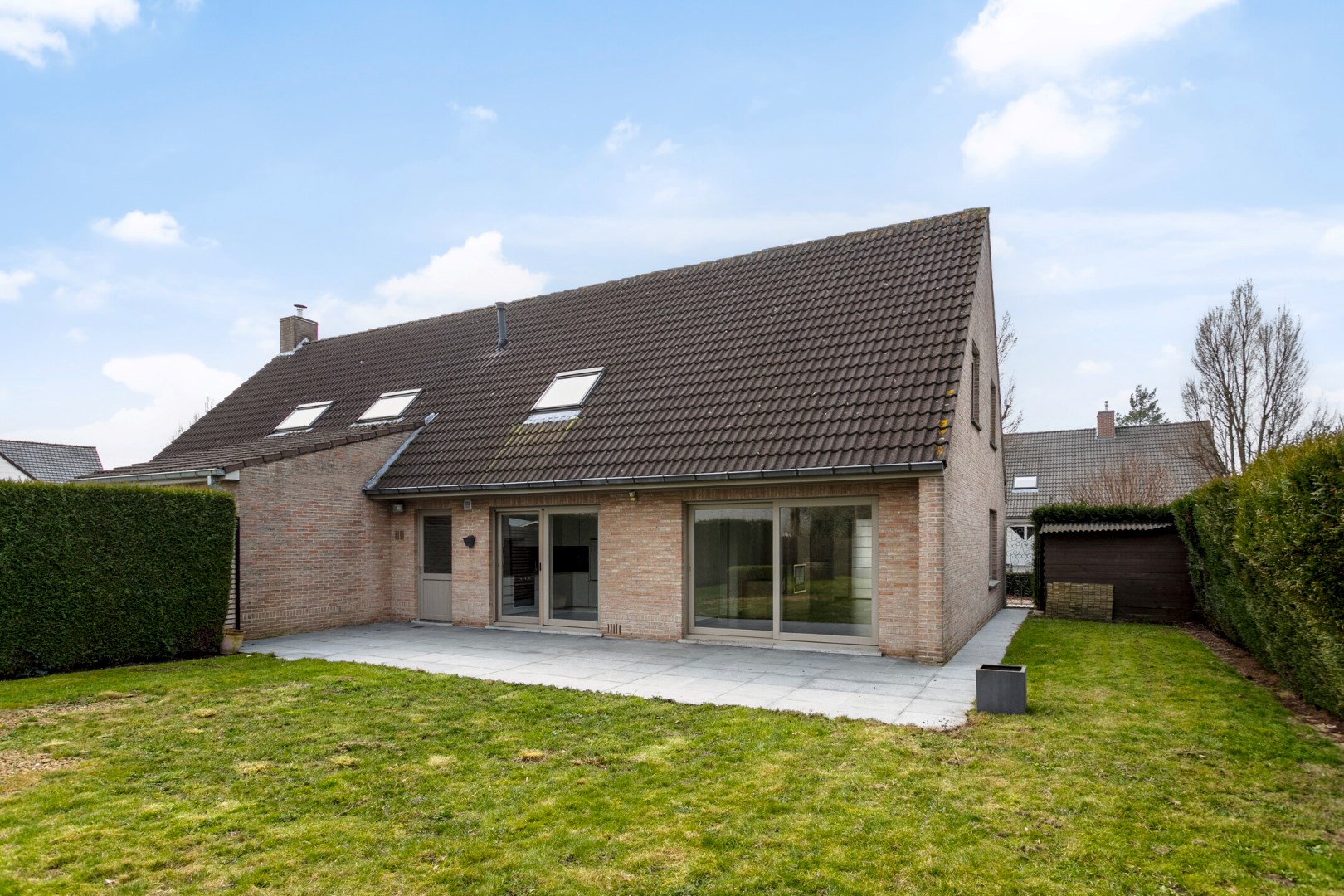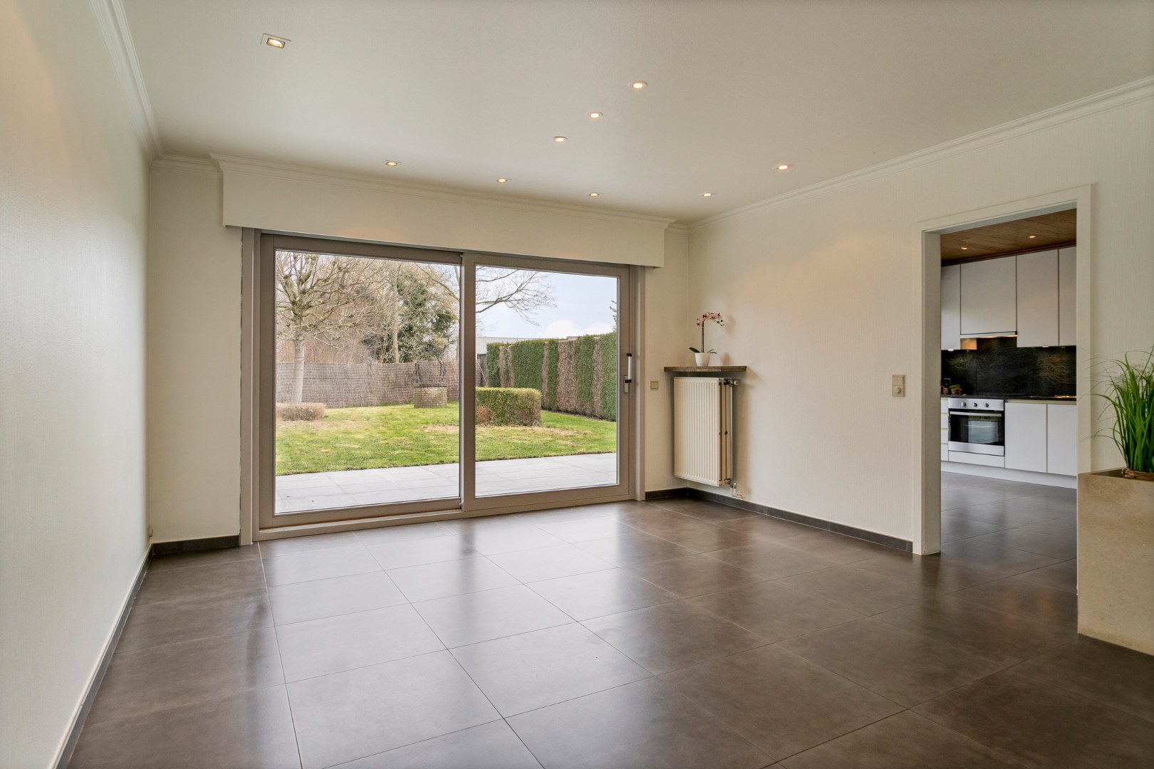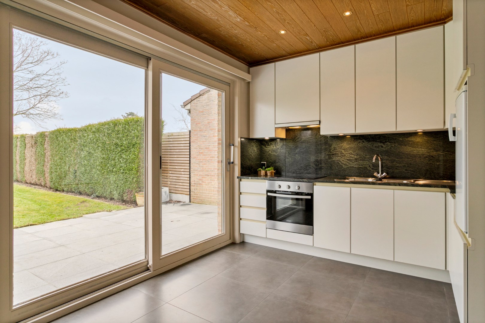 Vanuit de living en de keuken kunnen we via een schuifraam naar de mooie tuin met groot terras. Hier is het genieten in alle rust en privacy in een groene omgeving!