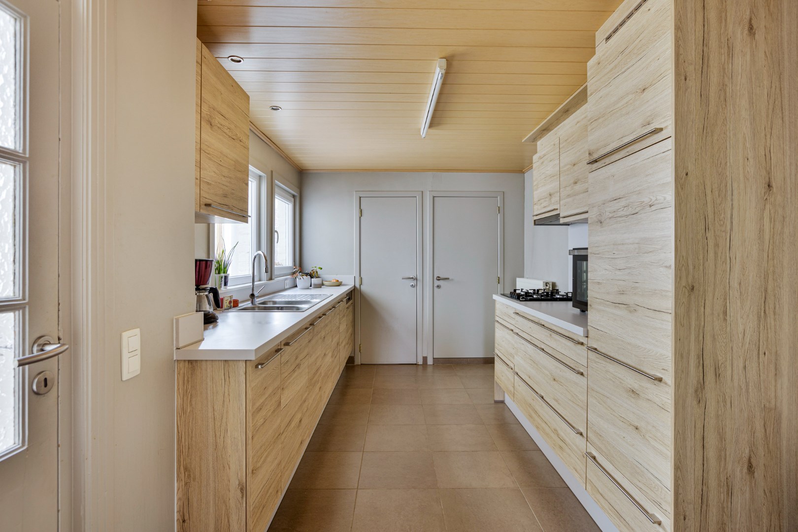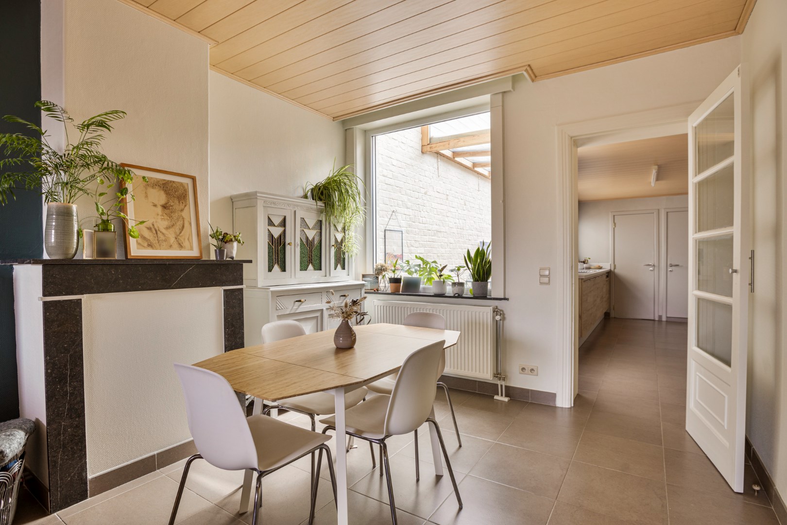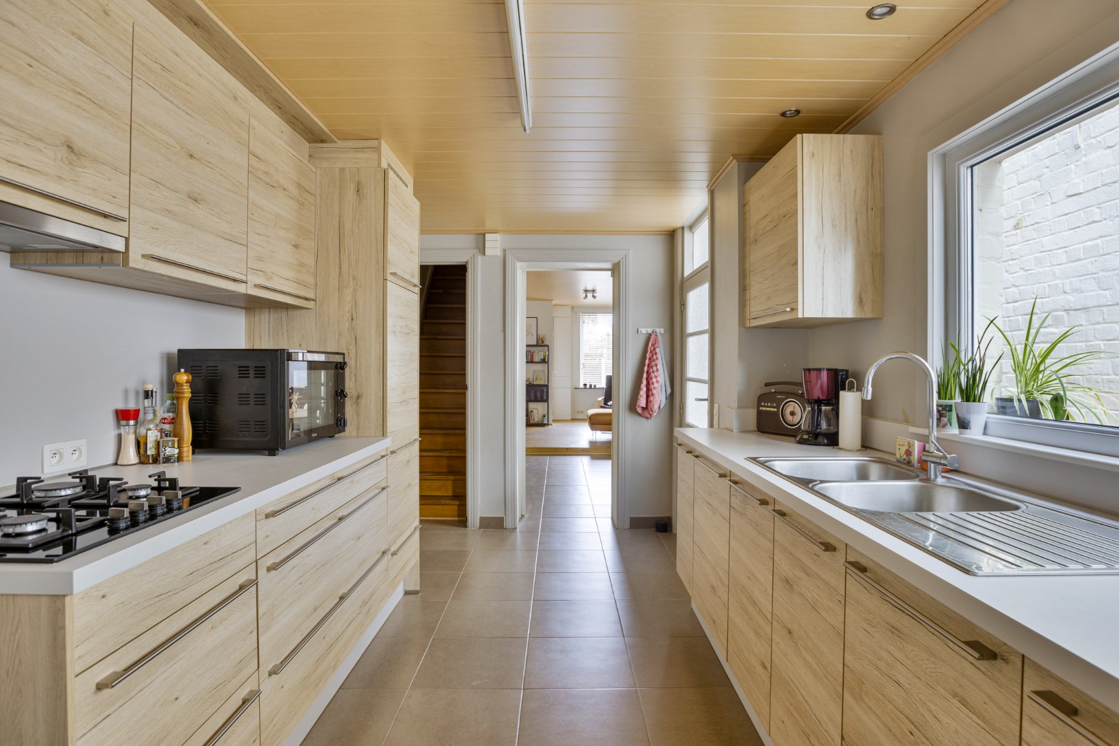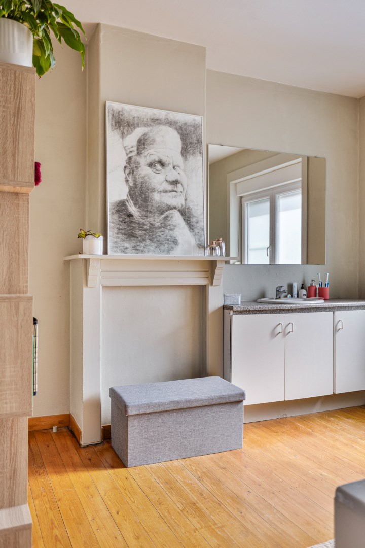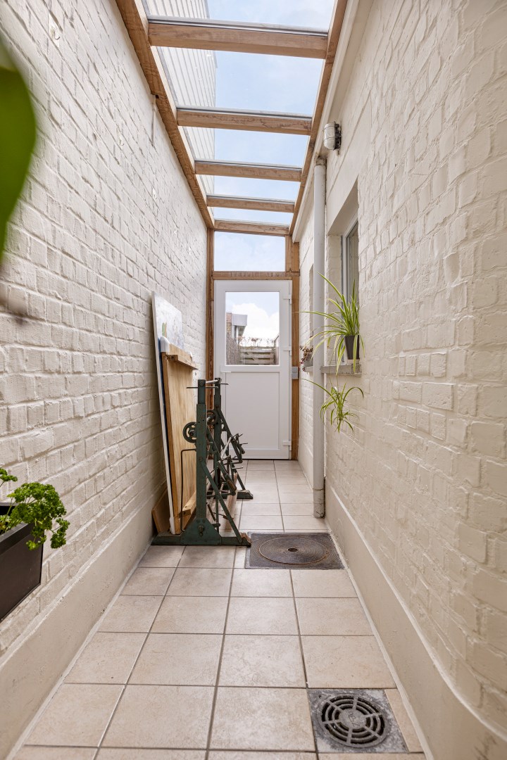 Via de hal komen we in de leefruimte. Deze is opgesplitst in een eetkamer en een zithoek op parket, wat het extra gezellig maakt. Aansluitend vinden we de mooie vernieuwde keuken. Van hieruit kunnen we naar de veranda die toegang geeft tot de stadstuin. Deze is zuid georiënteerd en beschikt over een ruime berging, die bereikbaar is via een wandelpad achteraan. Ideaal dus voor fietsen of ander materiaal in op te bergen!