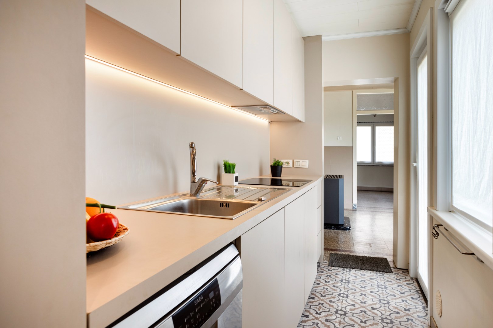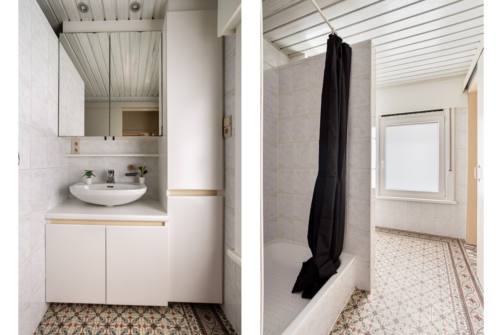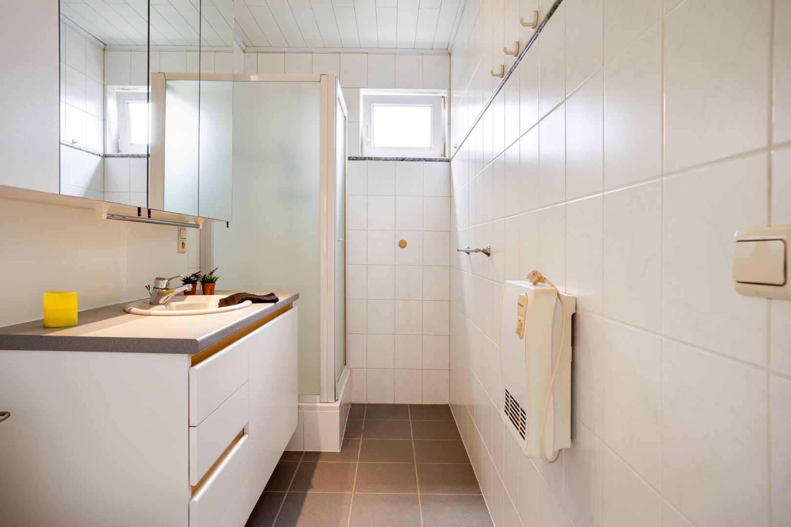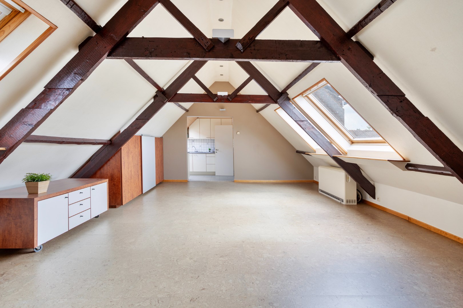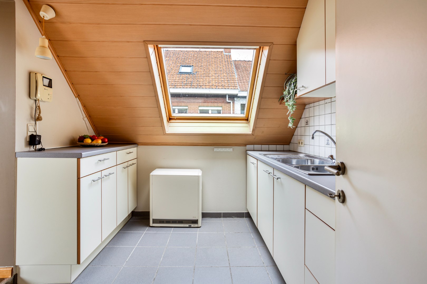 Via een berging komen we in de garage waar er een vaste trap is die ons naar de bovenverdieping brengt. Hier is een studio met aparte keuken en badkamer. Ook hier is in de badkamer een lavabo, toilet en douche terug te vinden. Wanneer we door de velux-ramen in de leefruimte kijken hebben we ook hier een mooi zicht op de Leie en de naastliggende velden.