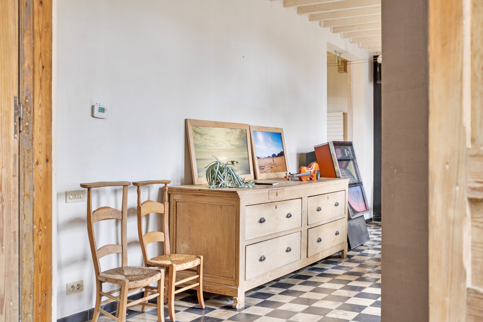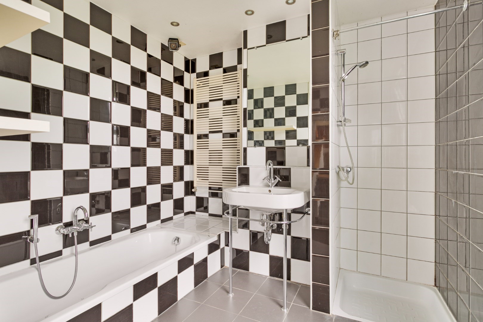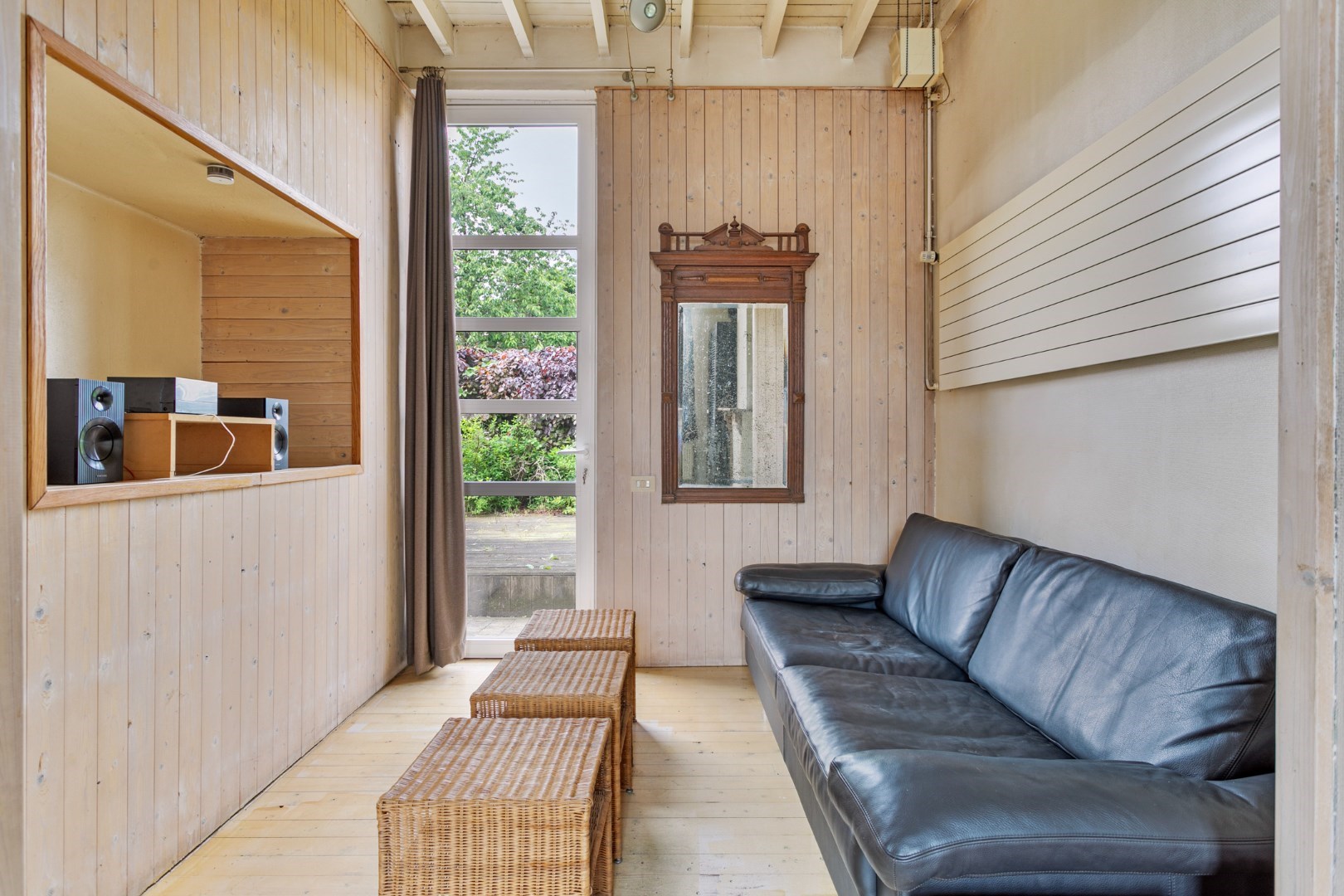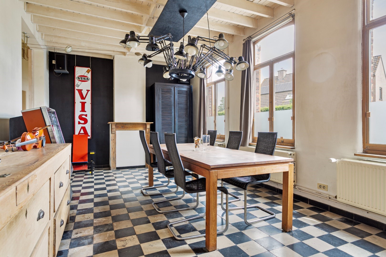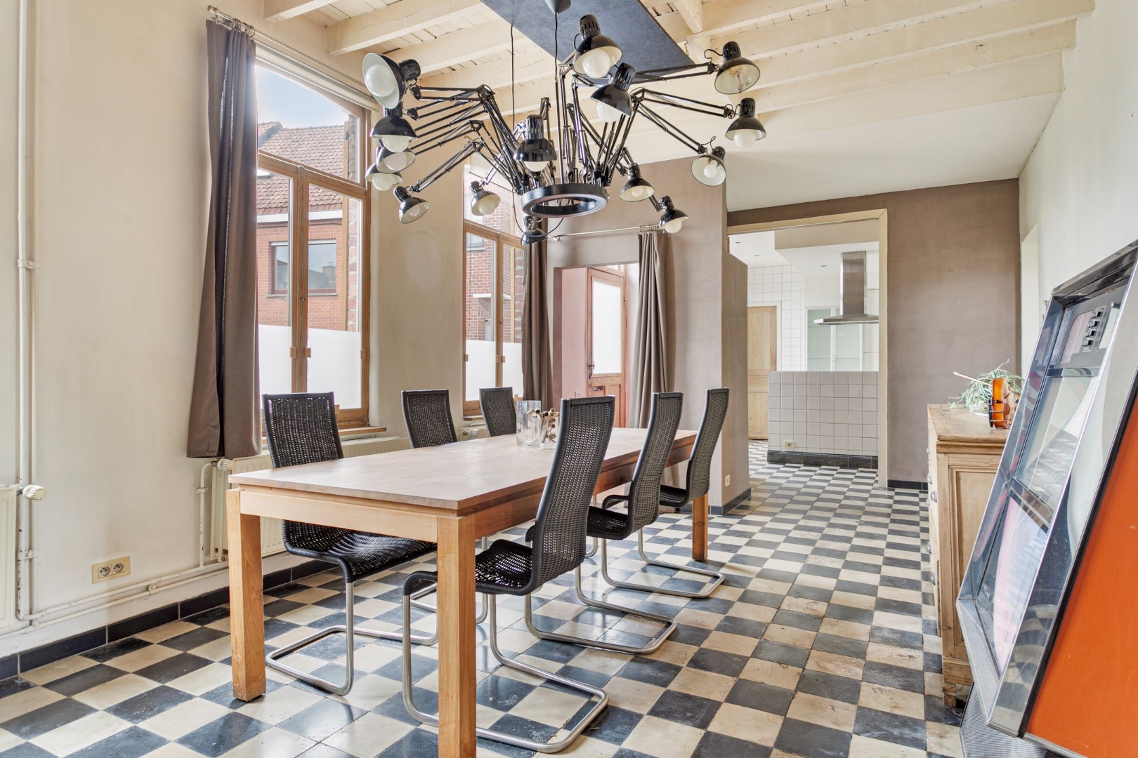 Bij binnenkomst in de leefruimte merken we meteen de nog originele wit/zwart-vloer op. Aansluitend is er de TV-hoek die toegang geeft tot de tuin. Door de vele ramen in de living en het TV-hoek is er hier altijd een overvloed aan licht.