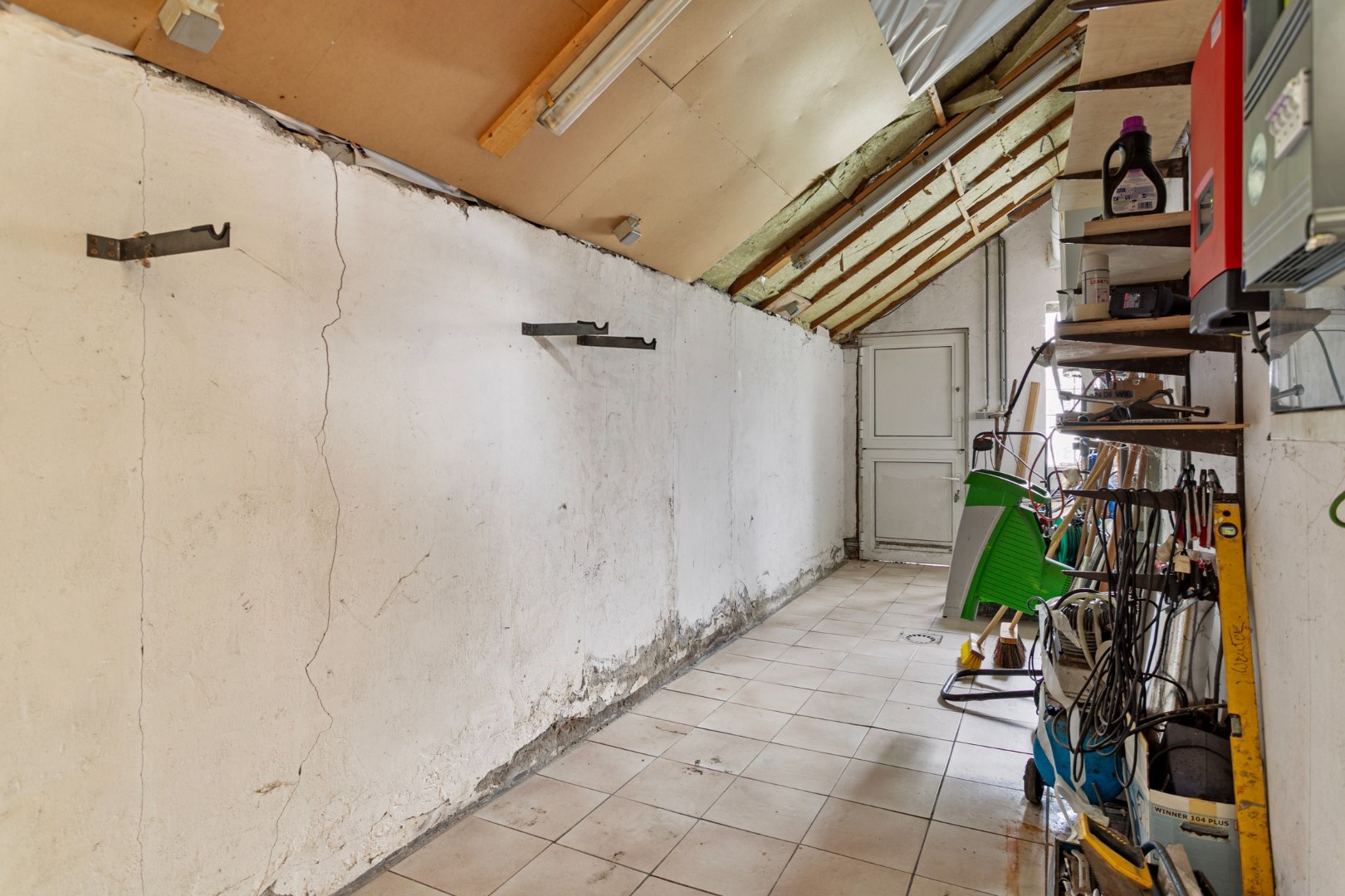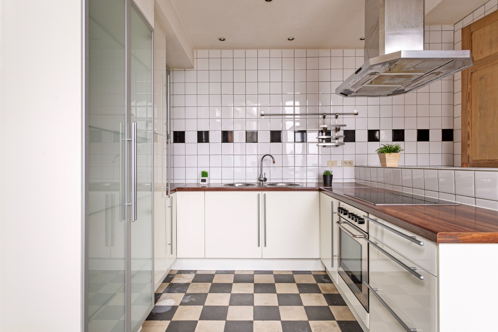 Via de originele houten deur stappen we vervolgens binnen in de keuken aan de linkerzijde van de woning. Tijdens de renovatie is ervoor gekozen om het zwart/wit-patroon door te trekken in de keukenelementen. Ook hier koken we in een zee van daglicht. Naast de keuken is er een handige berging waar plaats is voor een wasmachine, droogkast, …. De omvormer van de zonnepanelen bevindt zich hier ook. Ook vanuit deze berging kunnen we naar de tuin.