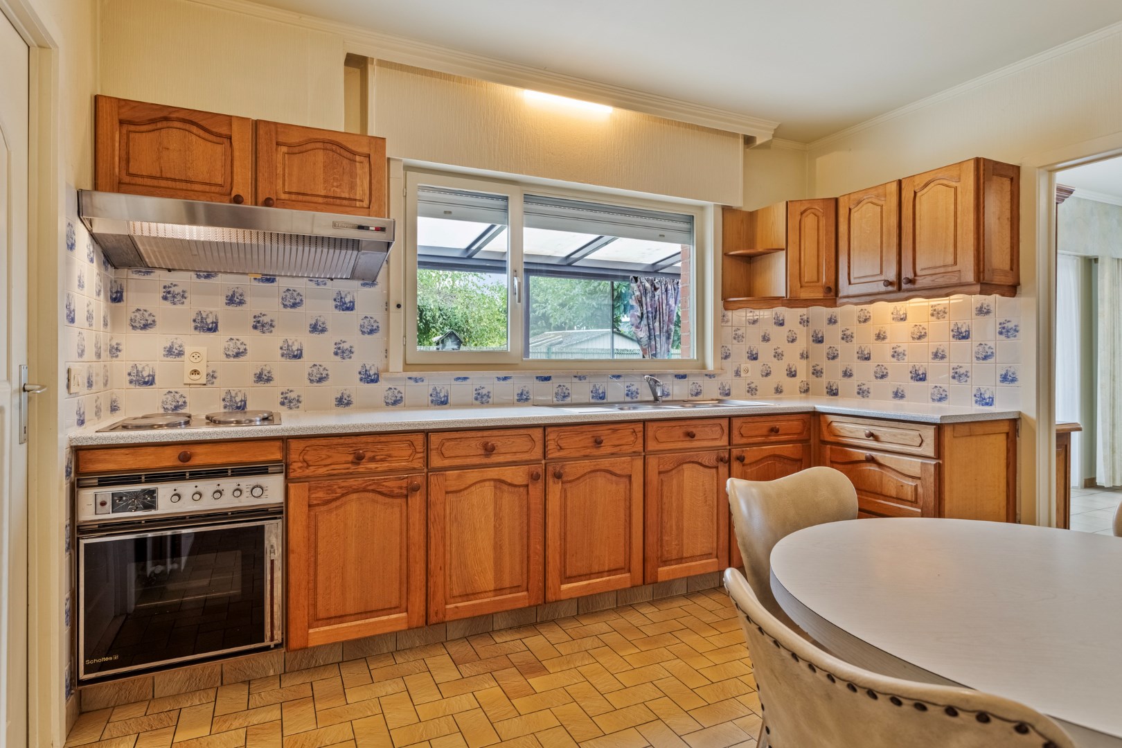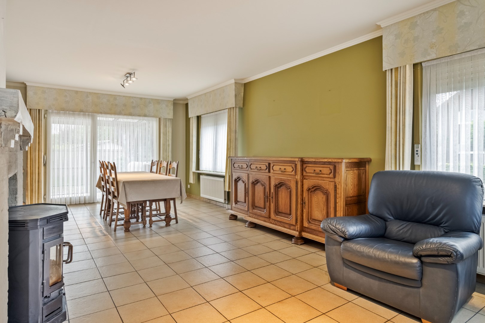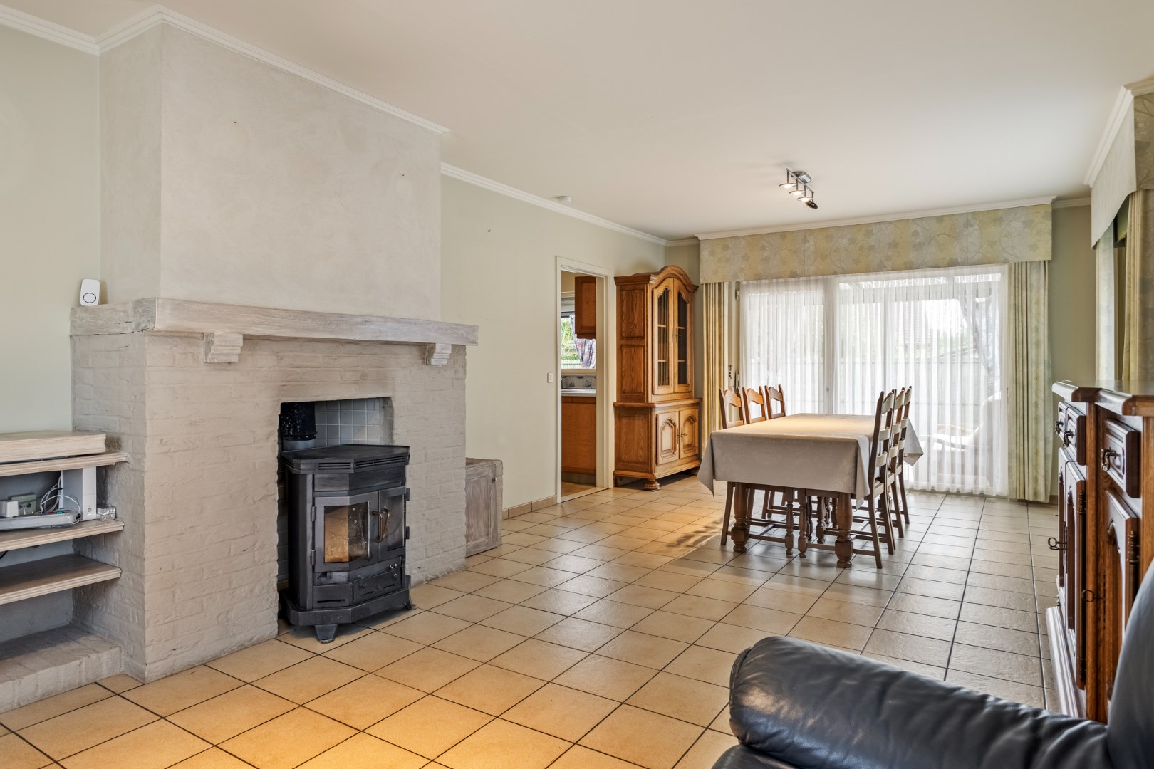 Via de grote oprit komen we aan de zijdelingse toegang. Deze ruime bungalow beschikt over een lichtrijke leefruimte met houthaard en aangrenzend een ruime keuken. Verder is er een bijkeuken en ruime berging.