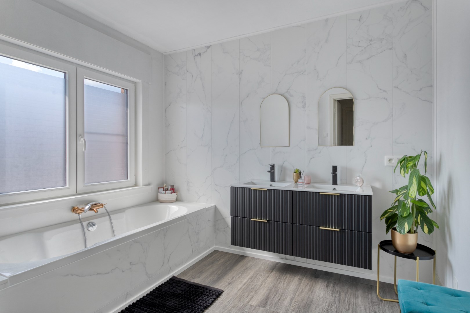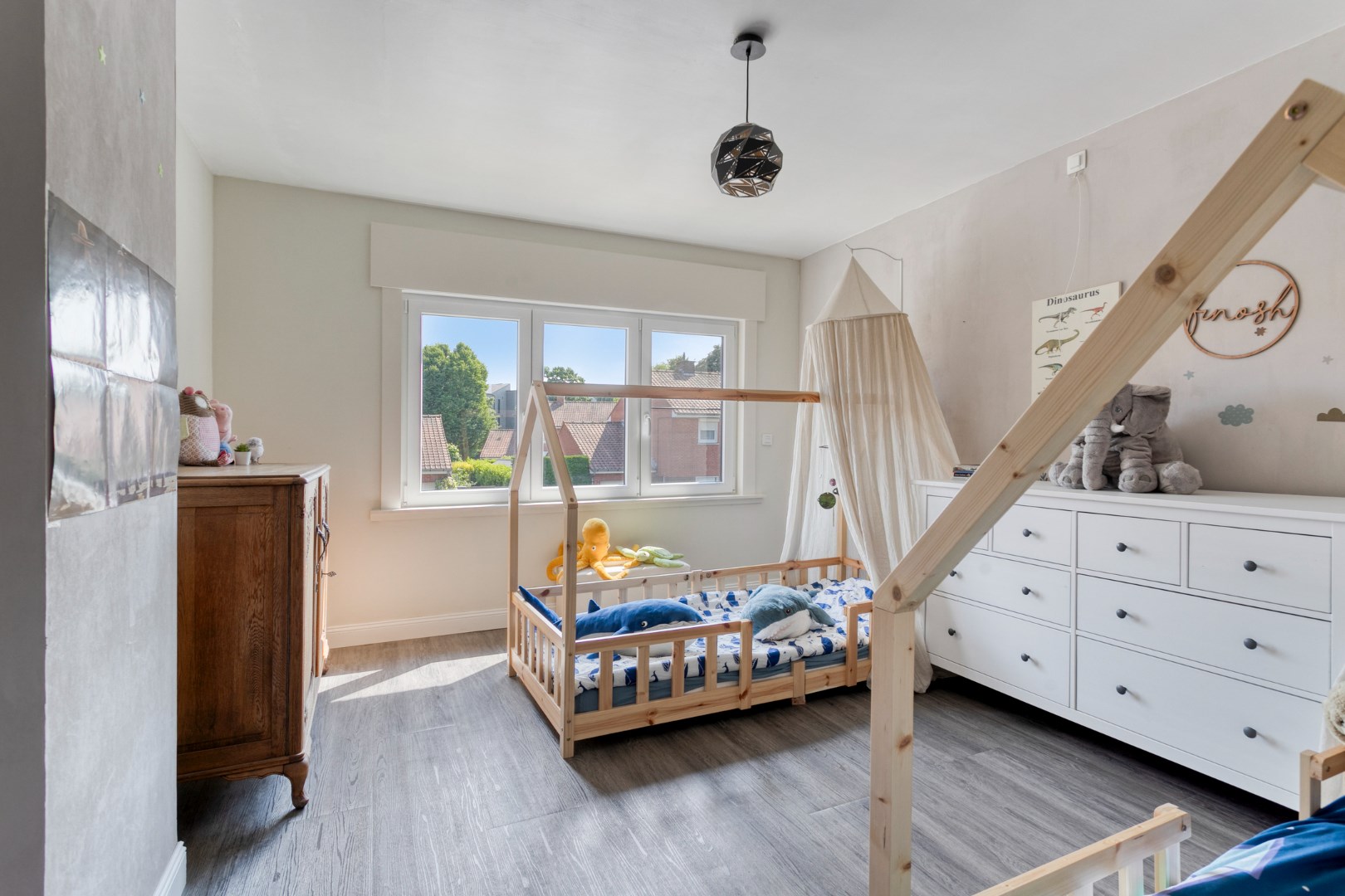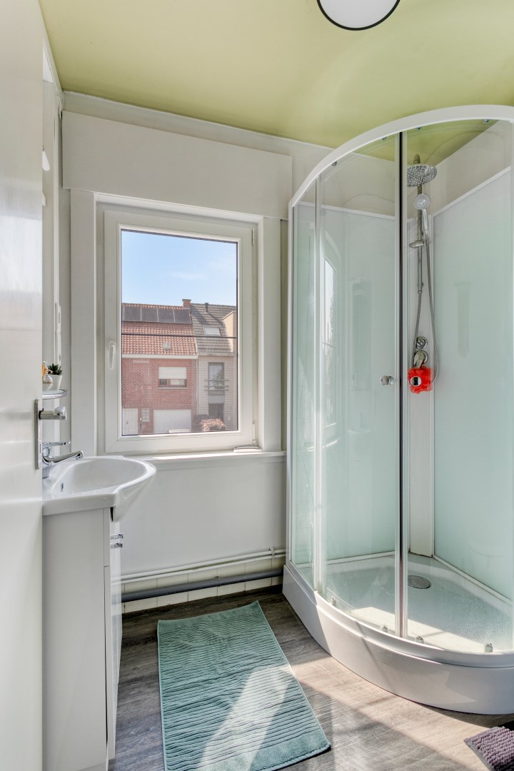 De eerste verdieping beschikt over 3 volwaardig slaapkamers, een vernieuwde badkamer met dubbel lavabomeubel en een ligbad. In een 2e badkamer vinden we nog een lavabo, douche en toilet.