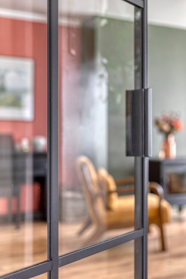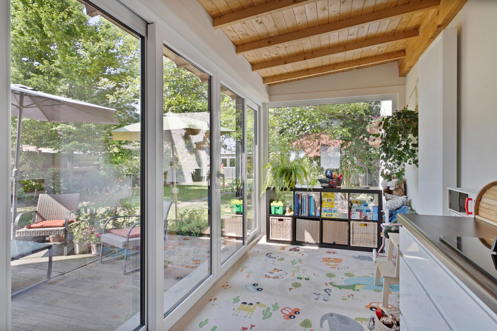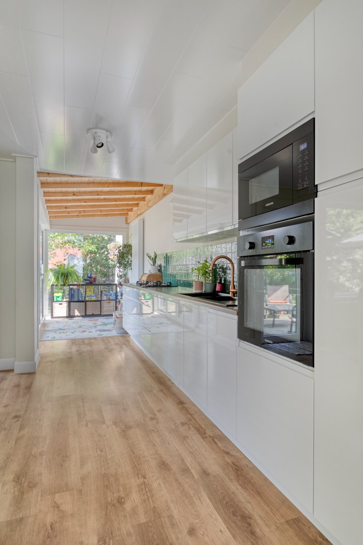 We komen de woning binnen in de mooie inkomhal met apart gastentoilet. Via de stalen glazen deur gaan we naar de prachtige lichtrijke living. Deze is ingedeeld met een zithoek en eetkamer. Meteen valt de mooie stijl op doorheen de gehele woning. Aangrenzend vinden we de nieuwe keuken met leuke ontbijthoek, opnieuw met zeer veel ramen. Hierdoor komt zeer veel licht binnen en hebben we een zicht op de prachtige tuin. Op het gelijkvloers vinden we nog een berging.