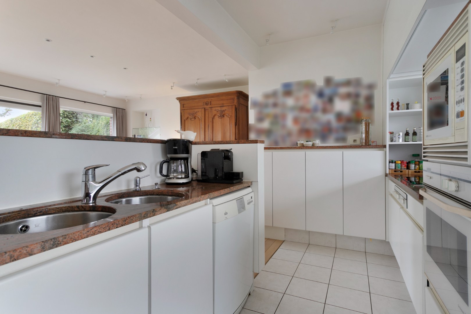 De living is adembenemend mooi en gezellig. Het vele daglicht is te danken aan de grote ramen en de vide op de bovenverdieping. Deze vide zorgt voor veel licht op het gelijkvloers. In het lager gelegen zitgedeelte, waar we de indruk krijgen dat we opgaan in de tuin, zorgt een houtkachel voor een gezellige toets. Het parket en de houtelementen maken ook hier het plaatje af. Wanneer we er omhoog kijken, krijgen we een fantastisch kijk op de mezzanine.