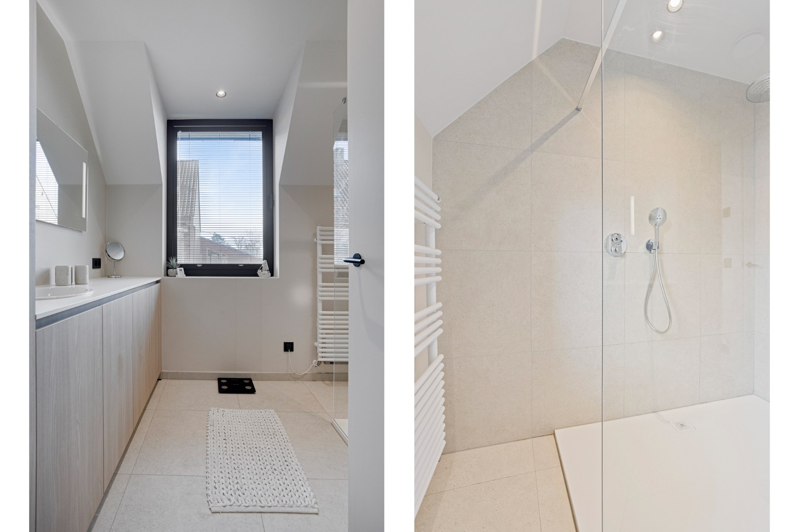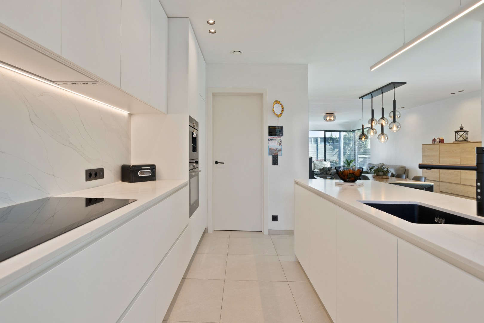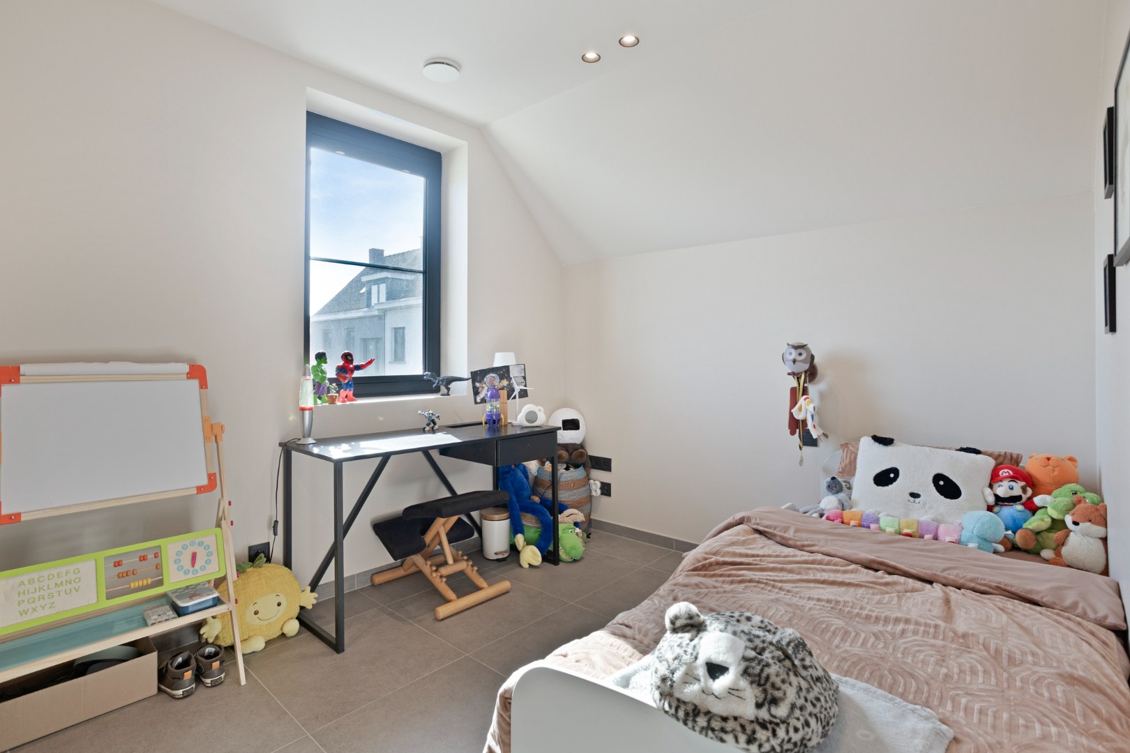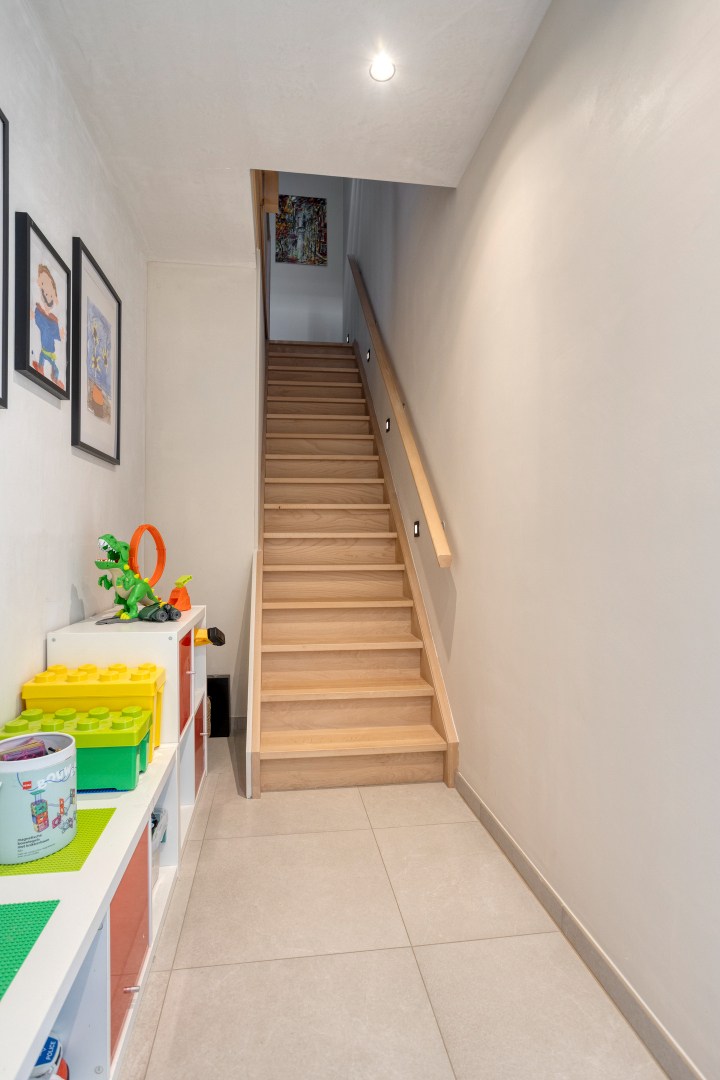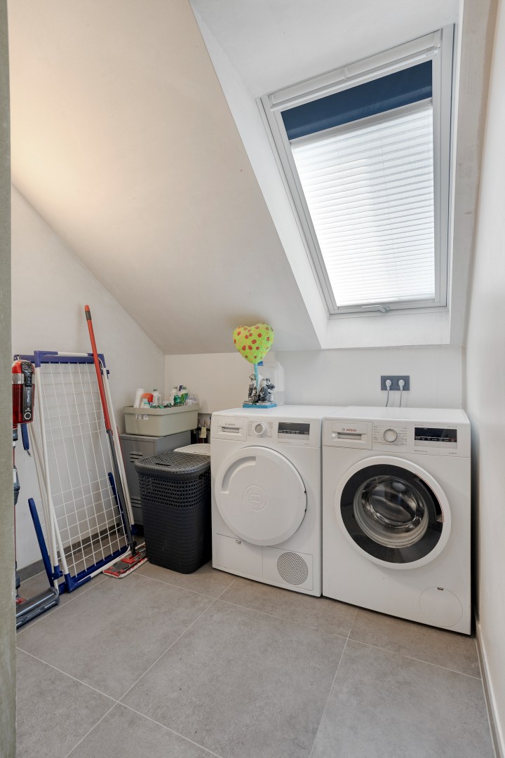 De open designkeuken aan de voorzijde vormt het hart van de woning en is uitgerust met een elegant eiland en hoogwaardige toestellen, waaronder een Aqualex-kraan, grote combi-oven, inductiekookplaat, vaatwasser, ruime koelkast en een ingebouwde koffiemachine. Aansluitend bevindt zich een praktische berging met warmtepomp en waterontharder. Op de eerste verdieping vinden we een ruime master bedroom met vaste wandkast, twee volwaardige kinderkamers, een apart toilet en een afzonderlijke wasberging. De stijlvolle badkamer is uitgerust met een lavabo, een royale inloopdouche en bijzonder veel kastruimte. Via een vaste trap bereiken we de ingerichte zolderverdieping die momenteel dienstdoet als ontspanningsruimte, met daarnaast een aparte technische berging.