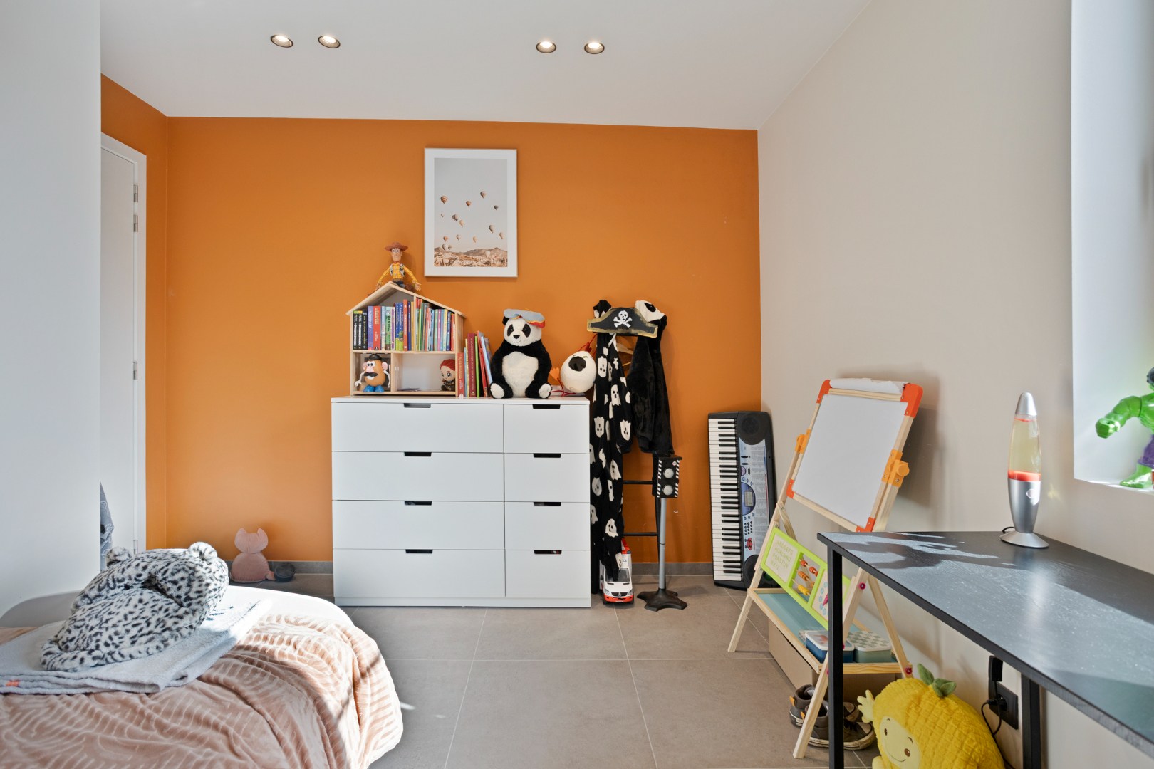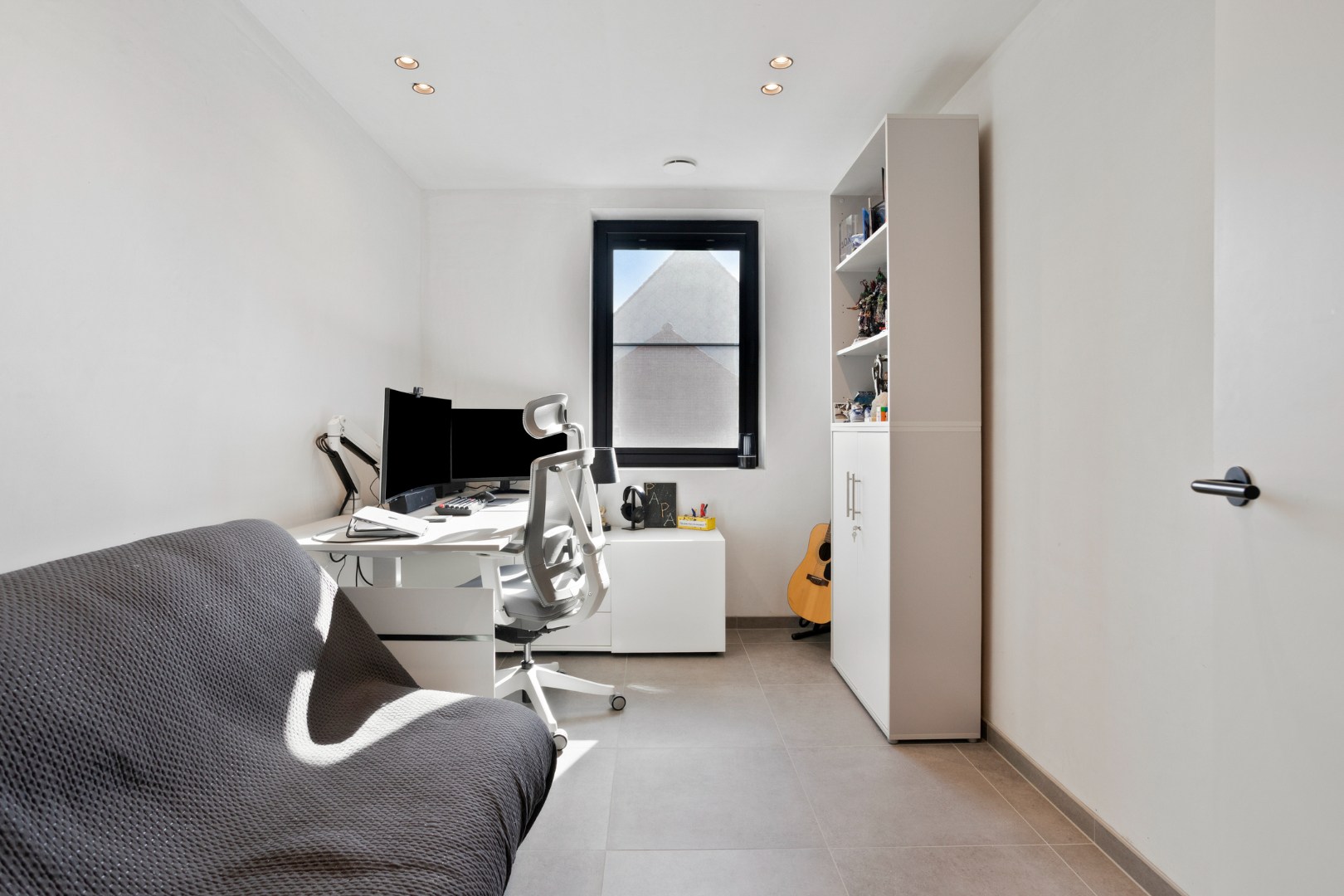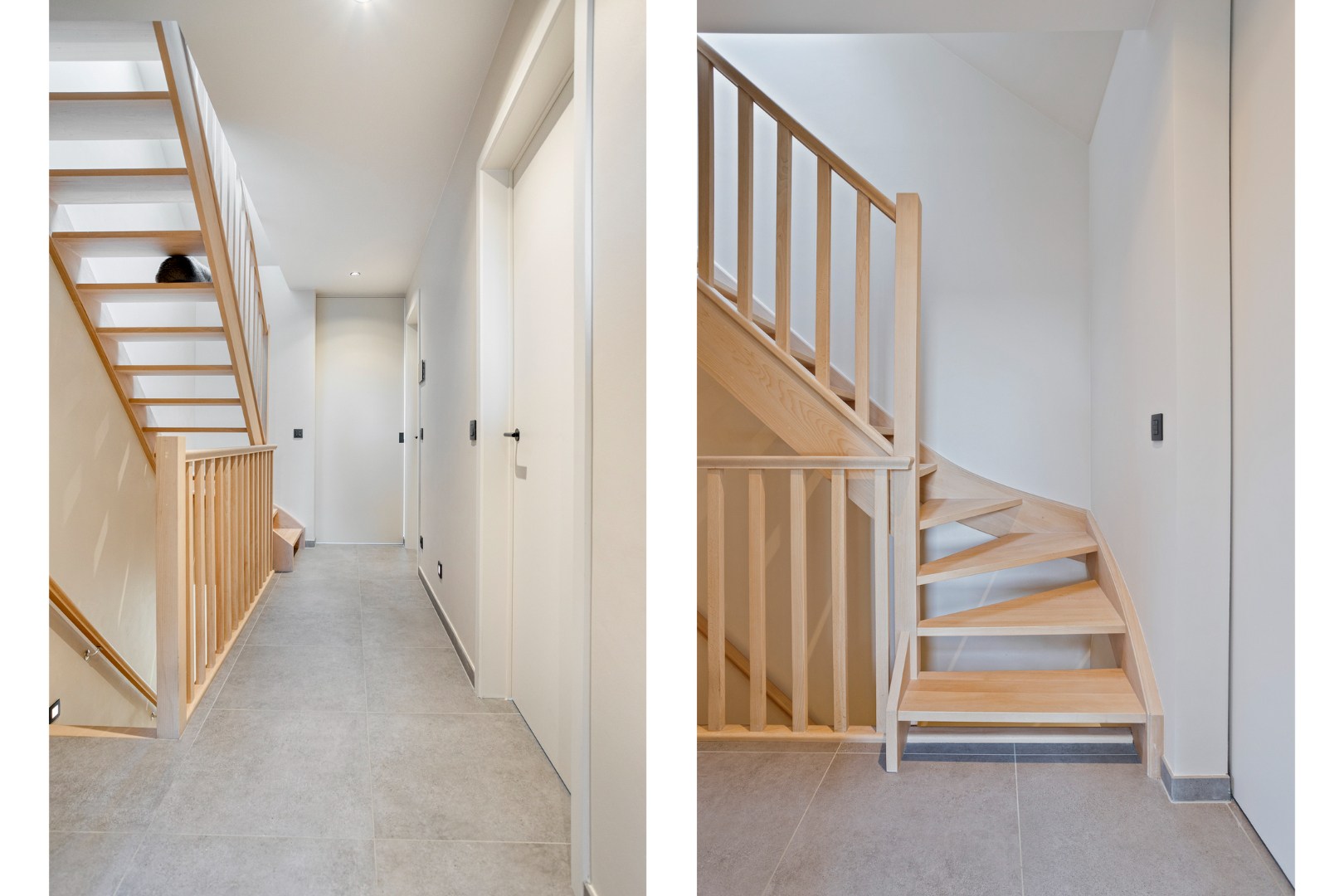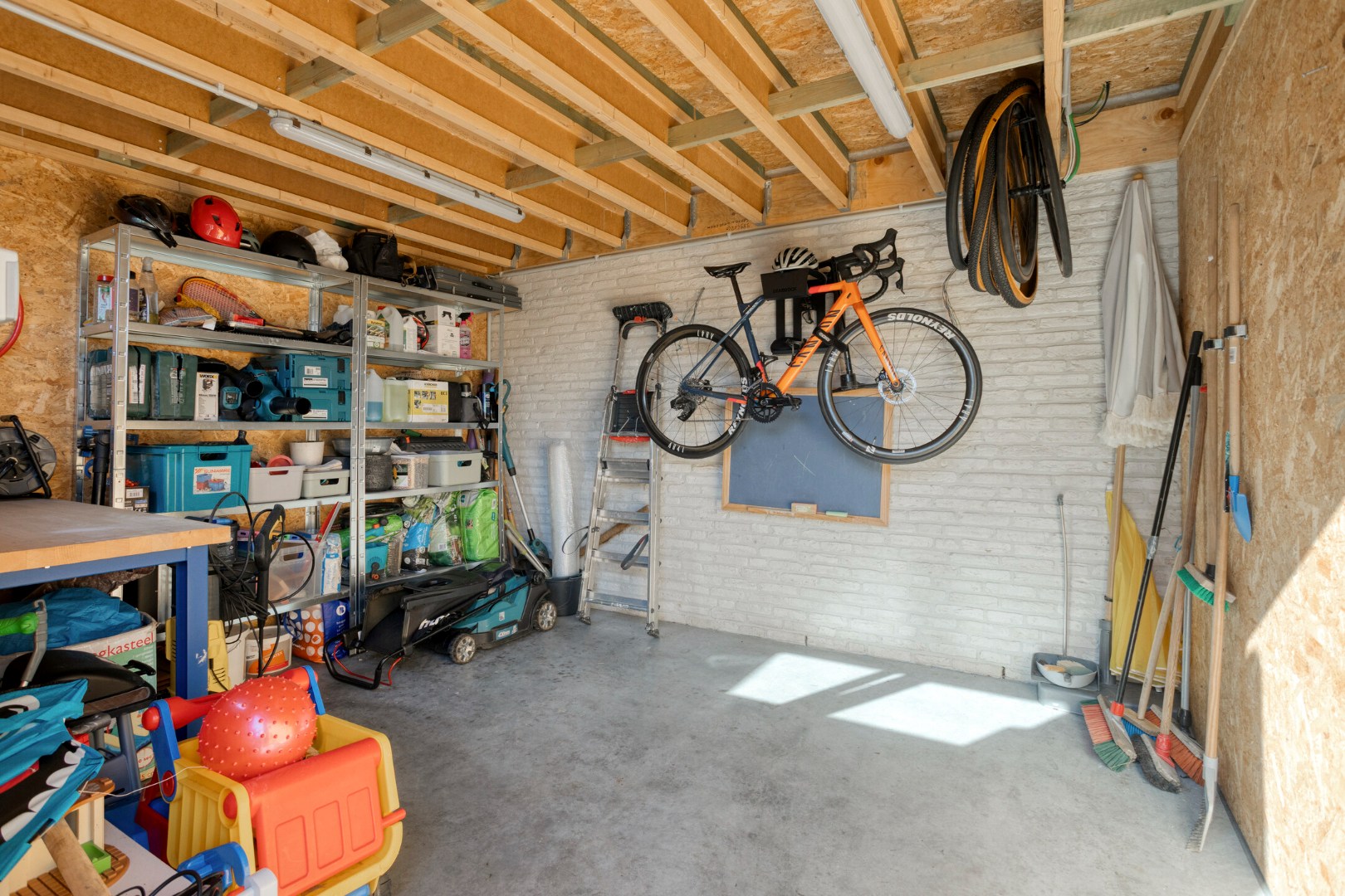 De open designkeuken aan de voorzijde vormt het hart van de woning en is uitgerust met een elegant eiland en hoogwaardige toestellen, waaronder een Aqualex-kraan, grote combi-oven, inductiekookplaat, vaatwasser, ruime koelkast en een ingebouwde koffiemachine. Aansluitend bevindt zich een praktische berging met warmtepomp en waterontharder. Op de eerste verdieping vinden we een ruime master bedroom met vaste wandkast, twee volwaardige kinderkamers, een apart toilet en een afzonderlijke wasberging. De stijlvolle badkamer is uitgerust met een lavabo, een royale inloopdouche en bijzonder veel kastruimte. Via een vaste trap bereiken we de ingerichte zolderverdieping die momenteel dienstdoet als ontspanningsruimte, met daarnaast een aparte technische berging.