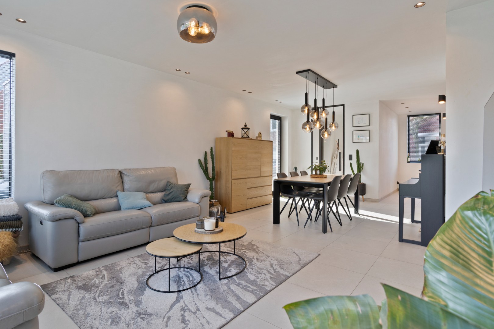 Welkom in deze uitzonderlijke halfopen woning waar luxe, comfort en vooruitstrevende technologie naadloos samenkomen. Gelegen op een uitstekende locatie vlakbij winkels, scholen en openbaar vervoer geniet u hier van een perfecte combinatie tussen rust en bereikbaarheid. Reeds bij aankomst valt de verzorgde architectuur en hoogwaardige afwerking meteen op. De oprit biedt plaats aan twee wagens en leidt naar een stijlvolle inkomhal met gastentoilet en vestiairekast. Via een glazen deur met zwart stalen frame betreden we de lichtrijke leefruimte, waar grote raampartijen en een indrukwekkend hoekraam zorgen voor een overvloed aan natuurlijk licht. De gezellige zithoek en ruime eethoek bieden beide een prachtig zicht op de aangelegde tuin en creëren een open, warme sfeer.