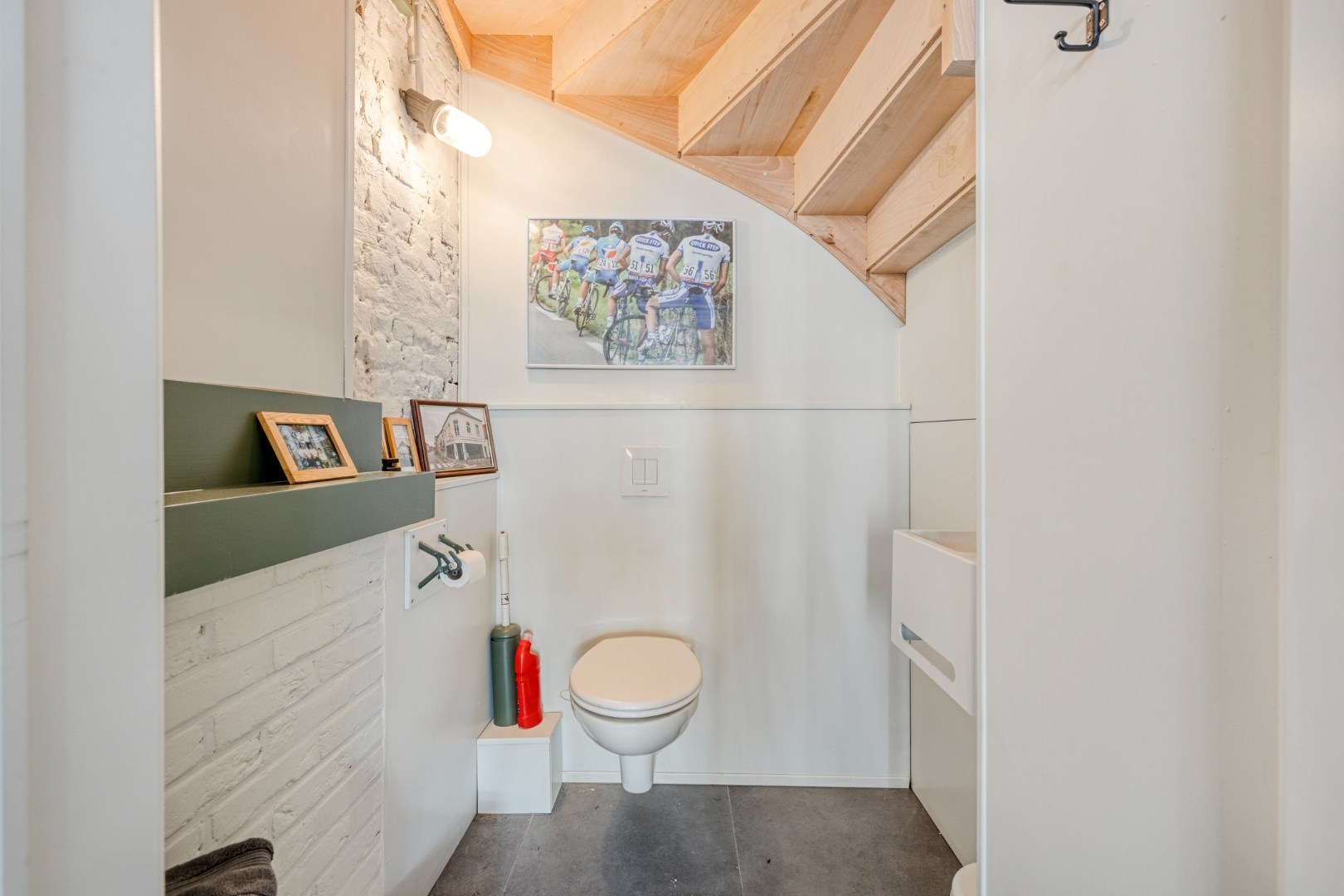Ernaast bevindt zich een ruime garage van ongeveer 45 m², uitgerust met een hoge poort van 3 op 3 meter en een praktische sectionaalpoort. Deze ruimte biedt tal van mogelijkheden voor stockage, werkruimte of extra parkeergelegenheid. In de garage bevindt zich ook een regenwaterput van 5.000 liter. Op het gelijkvloers is bovendien een sanitaire ruimte voorzien.