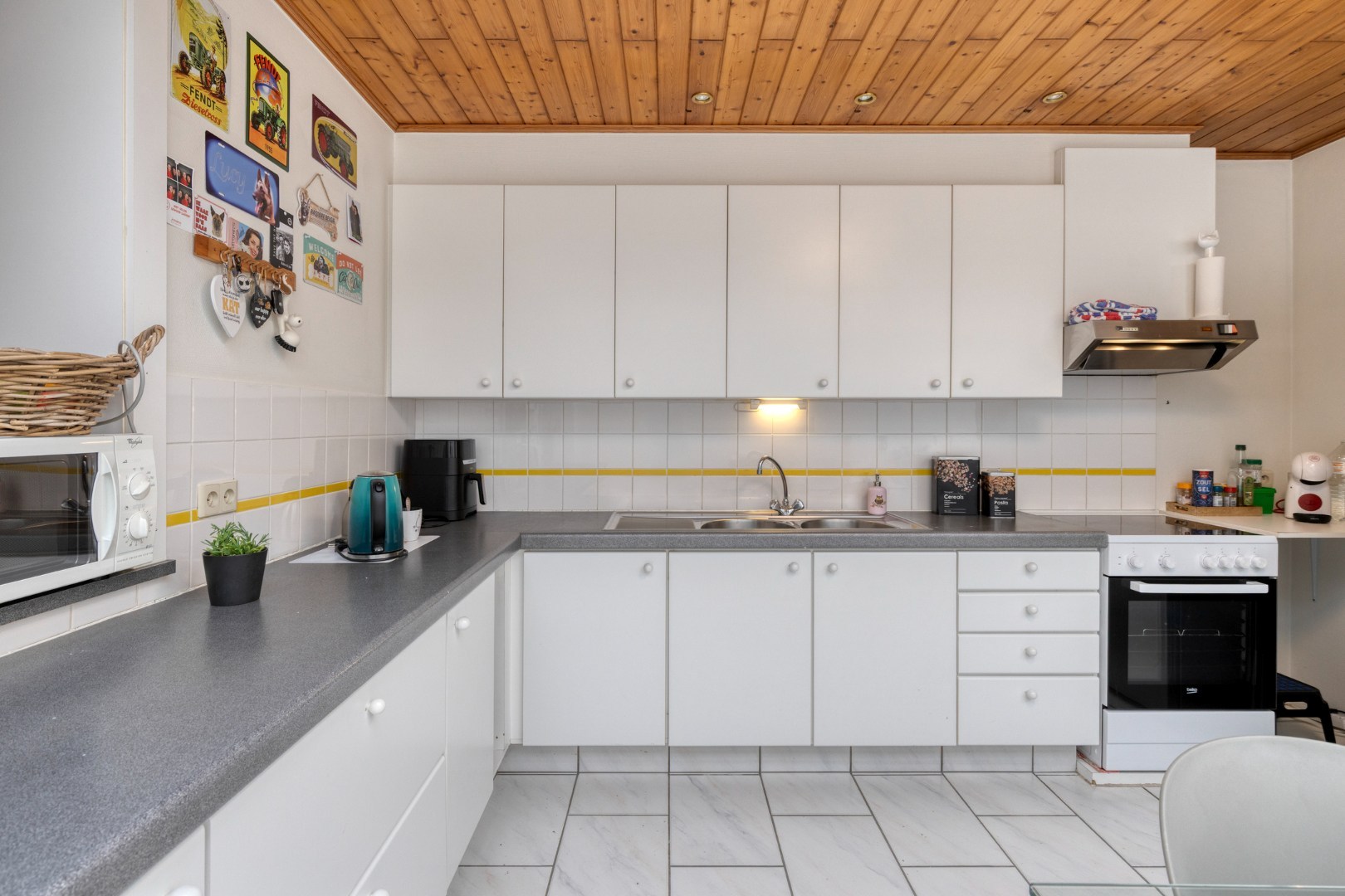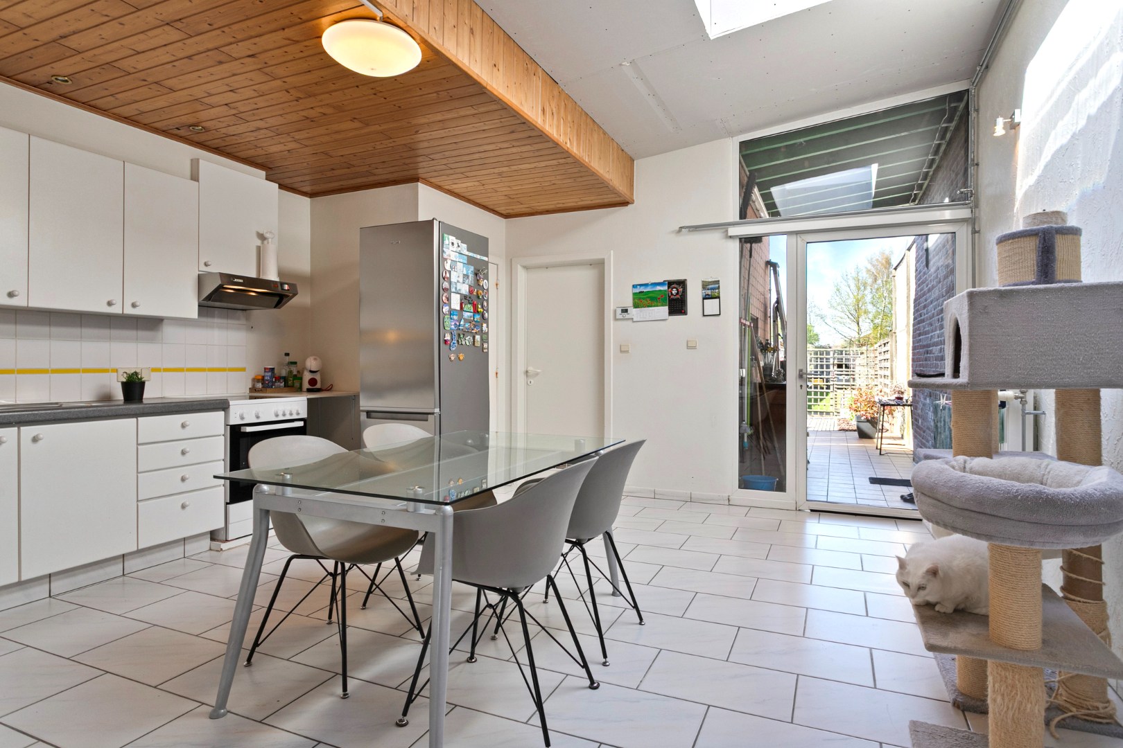 We parkeren de wagen op de oprit en stappen vervolgens de woning binnen. Via de inkomhal met trap naar de bovenverdieping gaan we verder naar de leefruimte. Deze is opgedeeld in een salon aan de voorzijde en een eetkamer. Deze wordt nu echter gebruikt als buro/ontspanningsruimte. Verder is er aanpalend een grote leefkeuken. Vorige maand werd het hellend dak in de keuken volledig vernieuwd. Achter de keuken bevindt zich de badkamer met lavabo, bad en douche. Het toilet is apart.