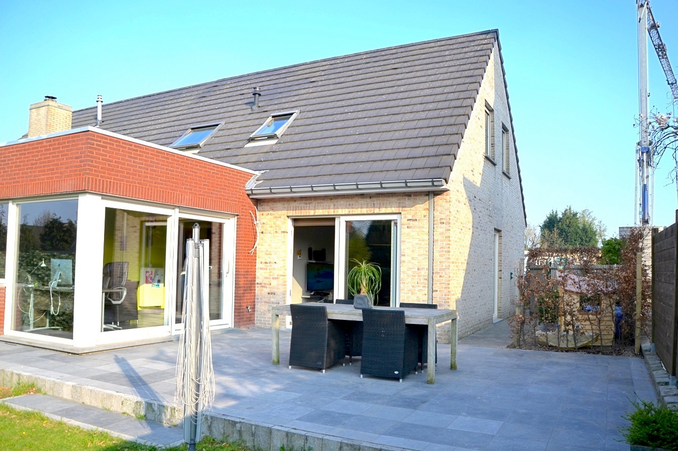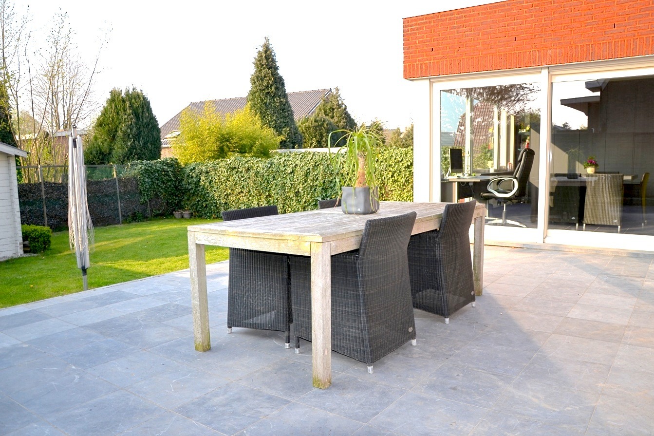 De tuin is mooi aangelegd met oa een zeer groot ZW terras en achteraan een handig tuinhuis. Vooraan is er een grote oprit.
