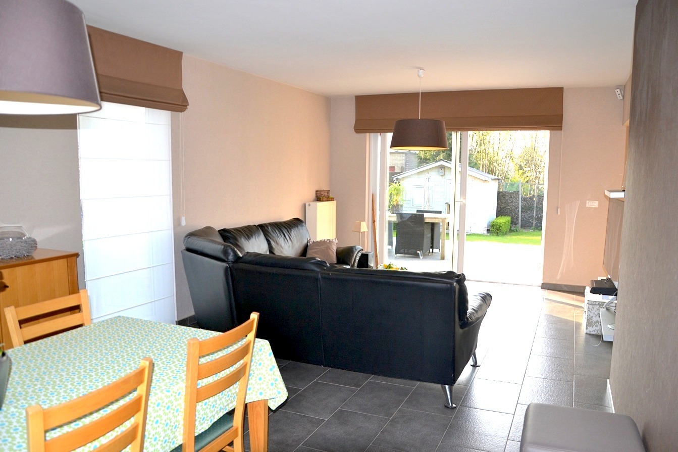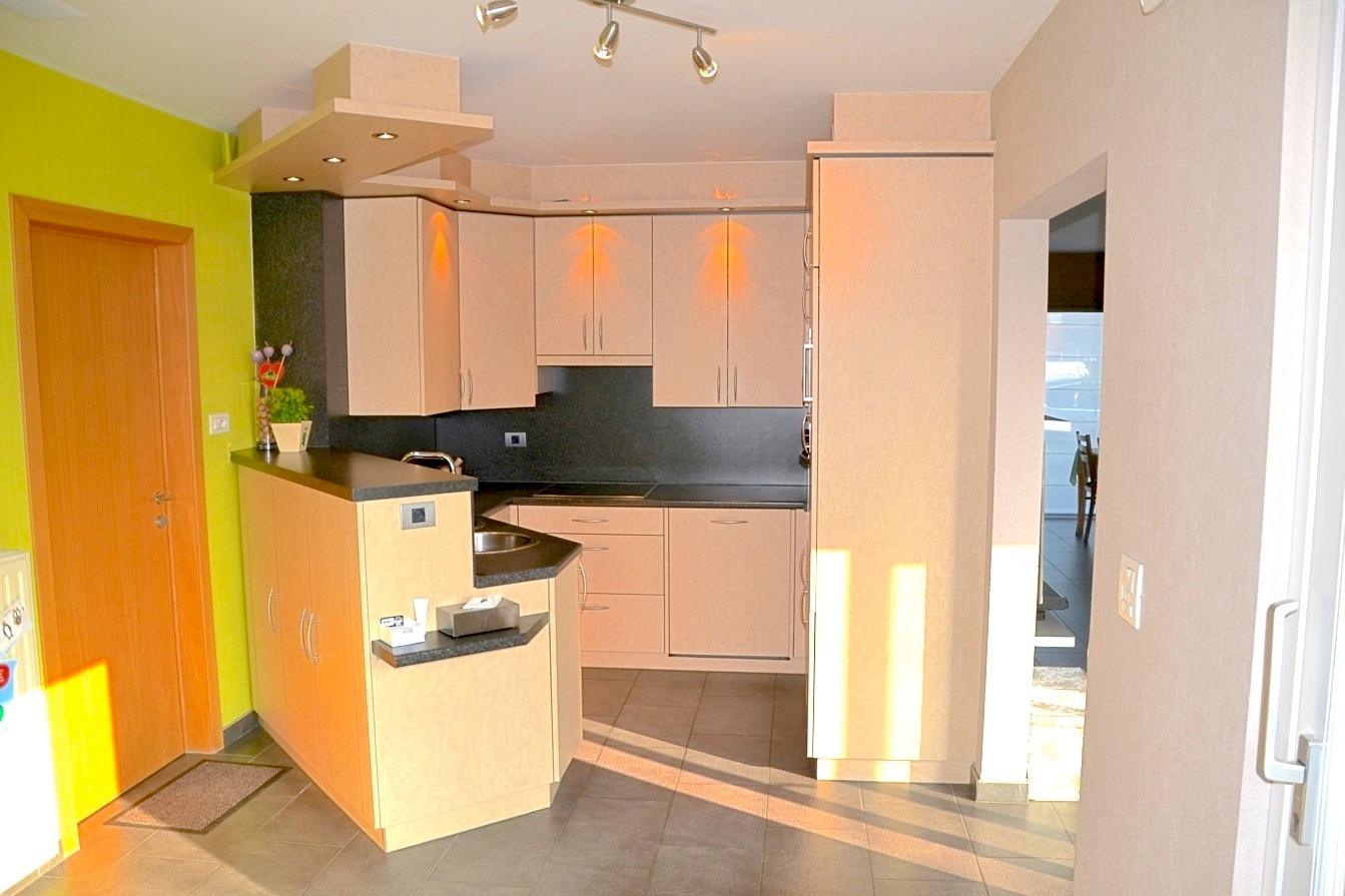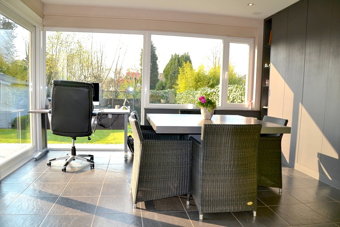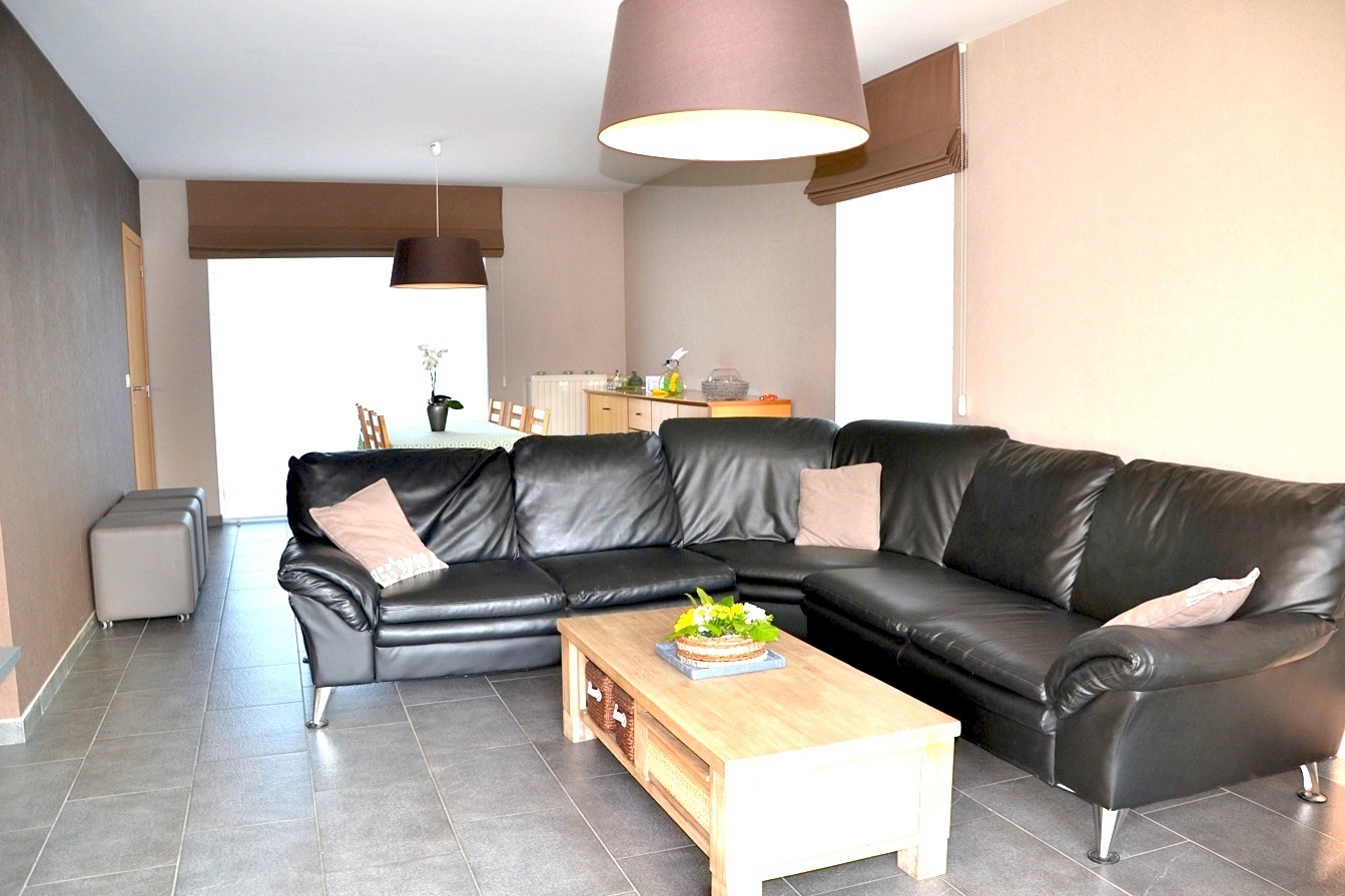 We betreden de woonst via de inkomhal met apart toilet om zo verder te gaan naar de living. Meteen valt de lichtinval op, en dit door oa het zijraam. Achteraan vinden we de ingerichte keuken met een recente bijbouw waar het bureau en de ontbijttafel staan. Aansluitend is er een berging met plaats voor wasmachine, diepvries,.... Ook de garage en kelder is van hieruit bereikbaar.
